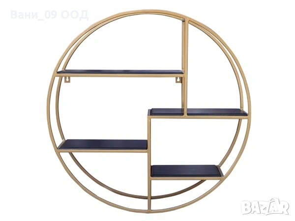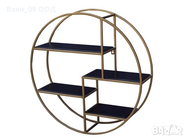 Изработката на етажерката крие съчетание от масив и метал. Притежава 4 рафтчета, обгърнати в златиста рамка. Преобладаващите гами във визията са - златиста и черна.