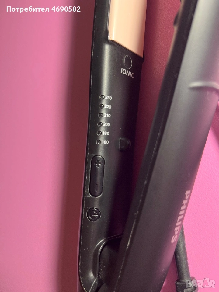Преса за коса на марката Philips. Употребявана е няколко пъти, но е в перфектно състояние и още е в гаранция. Характеристики: керамични плочи с йонно покритие с кератин, които допринасят за блясъка на косата; въртящ се кабел с дължина 1,8м; светлинен и звуков индикатор при достигане на желаната температура; вдига до 230°С за под една минута; технология ThermoProtect;