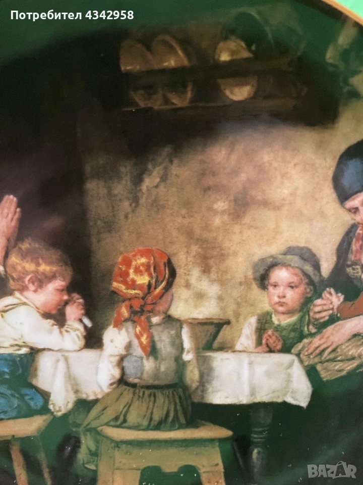 Чинията възпроизвежда прочутата картина „Das Tischgebet“ (Молитва преди хранене) на Franz von Defregger – топла и емоционална сцена от селския живот.
