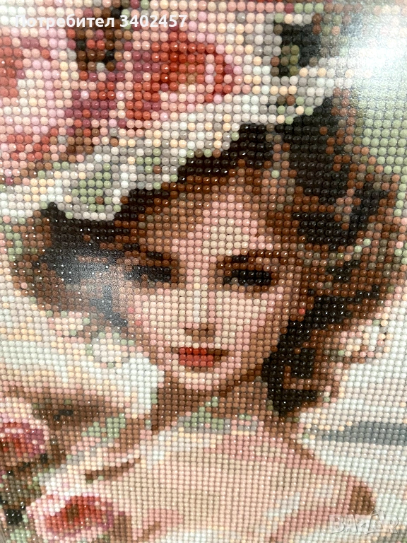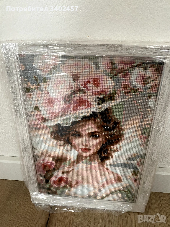 Диамантен гоблен, ръчна ичработка от диаманти (кръгли камъчета), с изображение на жена с цветя. Размер 27 x 37 см. С рамка, класически, елегантен вид.