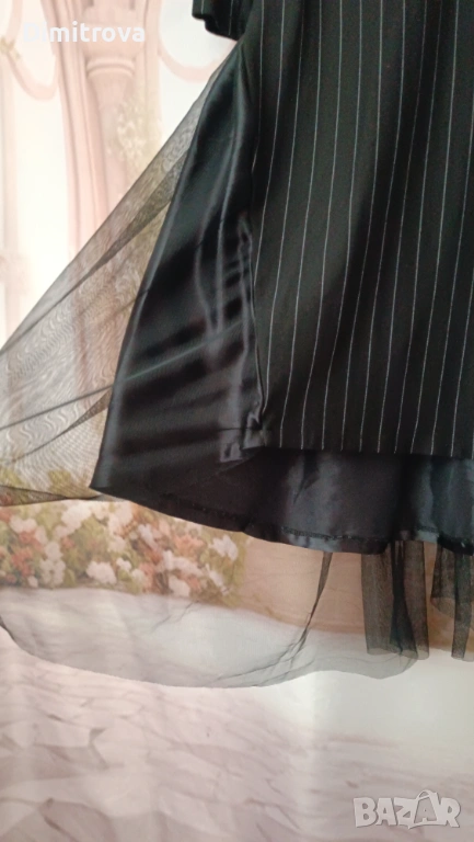 Рокля с асиметричен подгъв, комбинирана със сатен и дантелена пола в долната част, което я прави изключително елегантна и стилна. Идеална както за ежедневно носене, така и за повод.