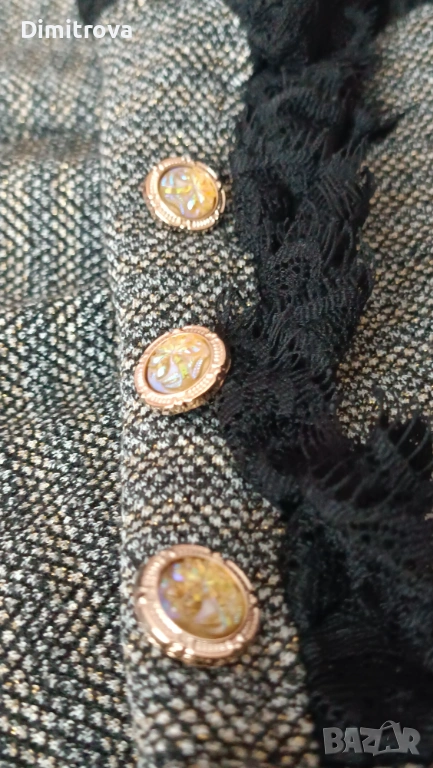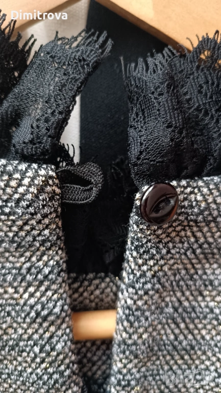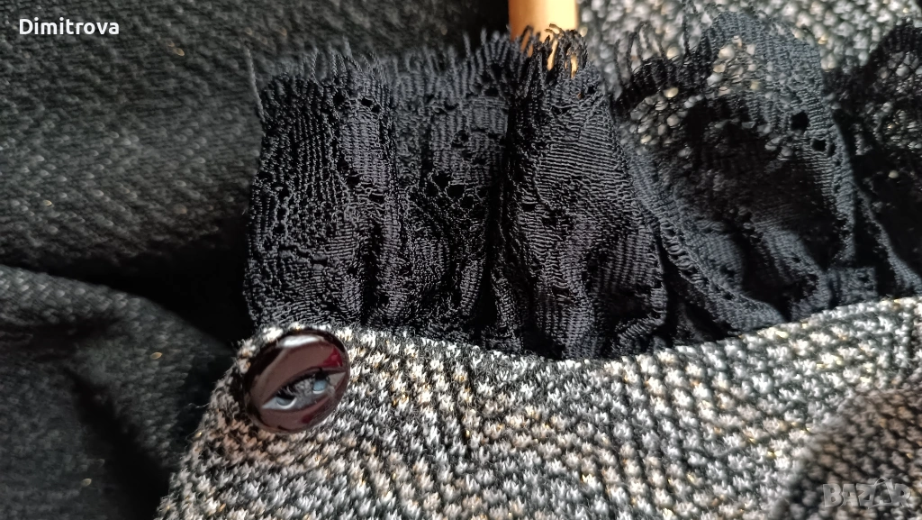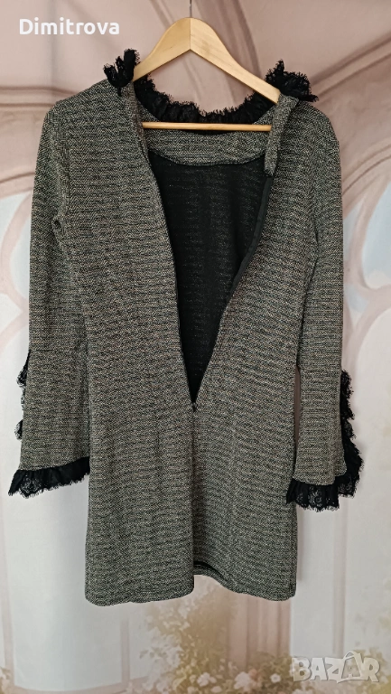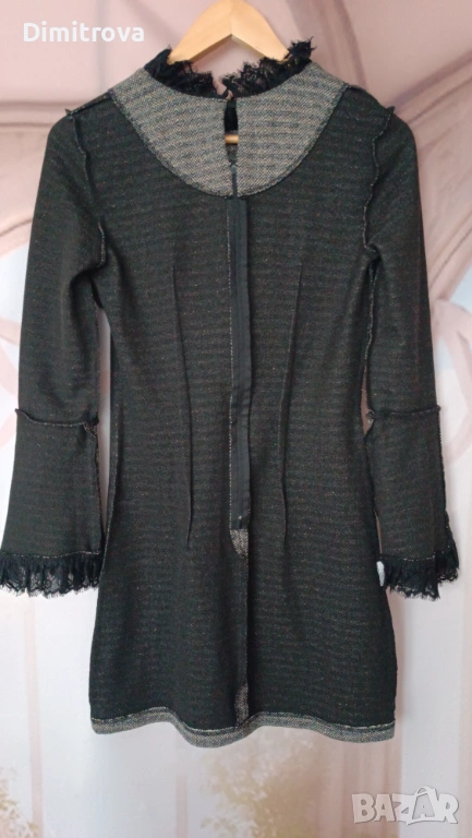 Красива рокля с нежен дантелен акцент по врата и ръкавите, които леко се разкрояват в края. Плътна, еластична материя, която приляга и очертава силуета, закопчава се с цип на гърба и копче.