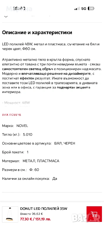 LED полилей 48W, метал и пластмаса, съчетание на бял и черен цвят, Ф60 см.