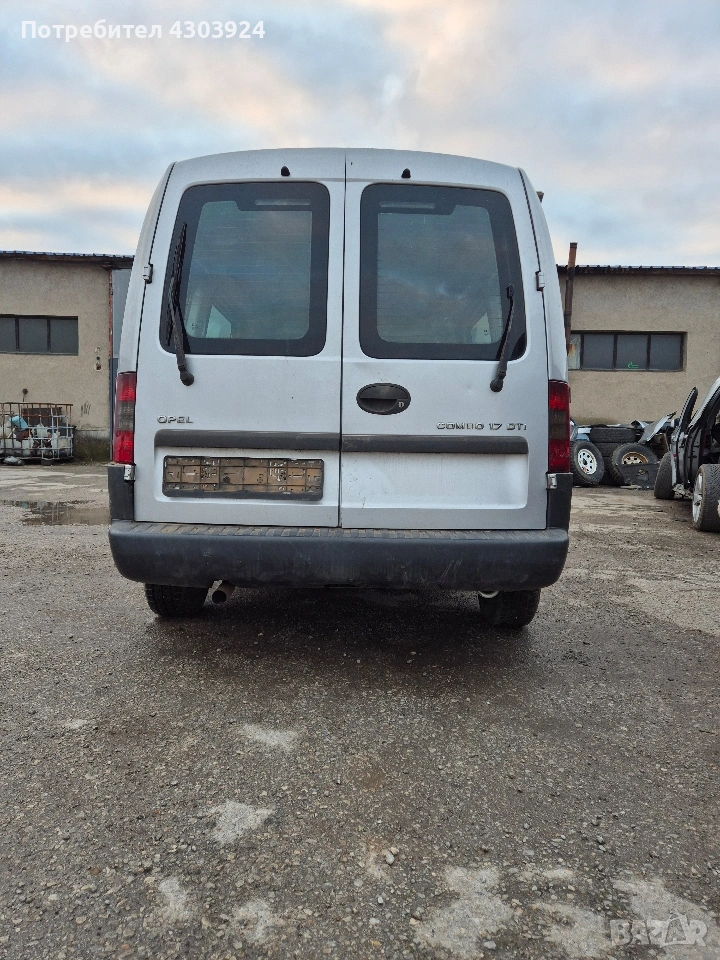Opel Combo 1.7 DTI tour. на части – Две странични врати, Задни тип Пеперуда Описание: Opel Combo 1.7 DTI (75 к.с.) на части. Двигателят е с код Y17DT (Isuzu) – . Колата разполага с две странични плъзгащи врати и задни врати тип „пеперуда“. • Двигател и периферия: ГНП компютър (EDU), компютър двигател, турбо, алтернатор с вакуум помпа, стартер, дюзи. • Купе: Задни врати (пеперуда), две странични плъзгащи врати, предни врати, преден капак, калници. • Интериор: Здраво табло, управление парно, седалки, кори, волан. • Ходова част: Скоростна кутия, полуоски, амортисьори, джанти. Забележки: • Всичко се сваля внимателно и се изпраща по куриер (Еконт/Спиди) с опция преглед и тест. • Разумни цени. При покупка на повече неща – отстъпка. • За големи части (врати, капаци) е възможно лично предаване. За повече инфо на лс или 0876900272.