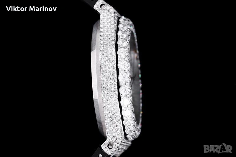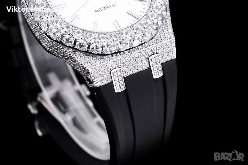 Часовникът е с автоматичен механизъм, прозрачен заден капак и масивна каса с диамантено инкрустиран безел и корпус. Циферблатът е в емблематичния Royal Oak стил с релефна текстура, апликирани индекси и дата на 3 часа. Каишката е от висококачествен черен каучук, удобна и подходяща за ежедневно носене.