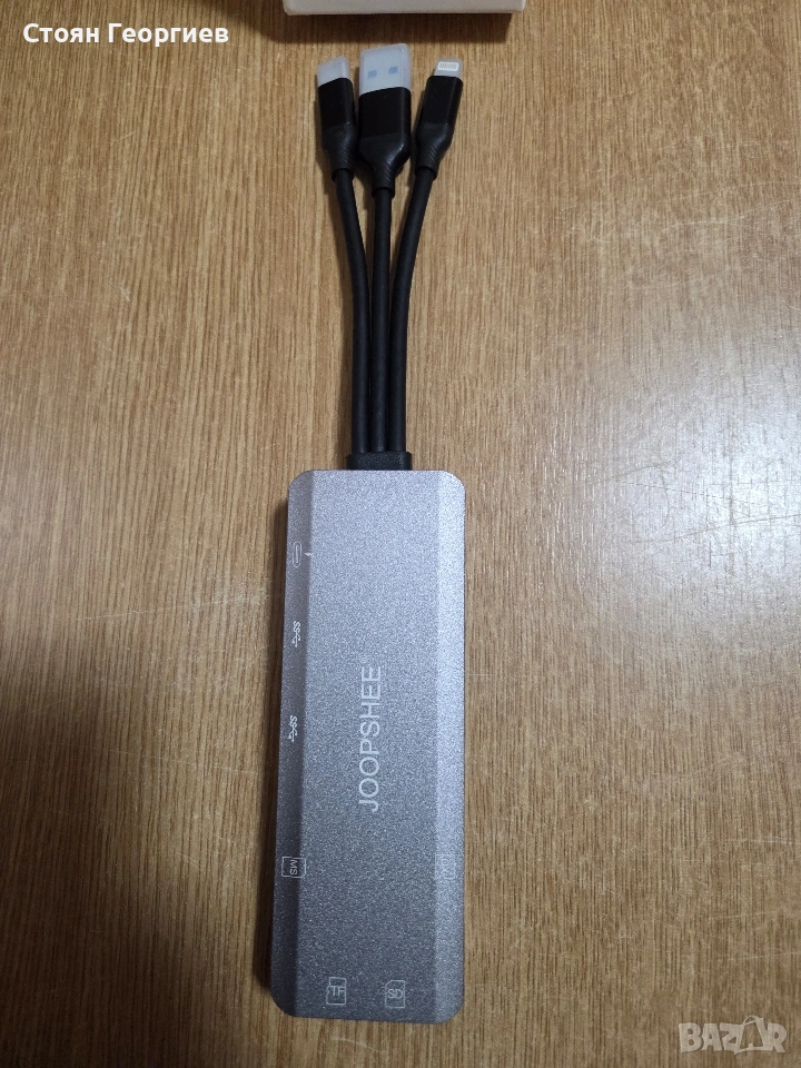Многофункционален четец за карти памет JOOPSHEE. Поддържа четене на различни типове карти памет, вкл Многофункционален четец за карти памет JOOPSHEE. Поддържа четене на различни типове карти памет, включително TF/SD/CF/MS/XD. Позволява едновременно четене. Съвместим е с операционни системи Windows, Mac, Linux и iOS/OTG Android смартфони. Устройството има множество конектори, показани на изображението. Изработен е от алуминий.