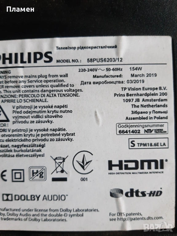 Борда е работещ демонтиран от ТВ PHILIPS 58" със счупен дисплей