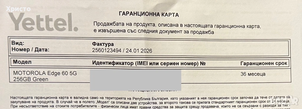 Motorola Edge 60 в зелен цвят – телефонът е абсолютно неразпечатан, с фабрично запечатана кутия и никога не е активиран/ползван. Закупен е на 24.01.2026 г. от YETTEL и е с пълна 36 месечна гаранция. Работи с всички оператори. Моделът е премиум клас и е отличен избор за човек, който търси максимално бърз и модерен телефон с топ камера система. Към телефона има всички документи. Без бартери!!!