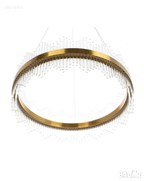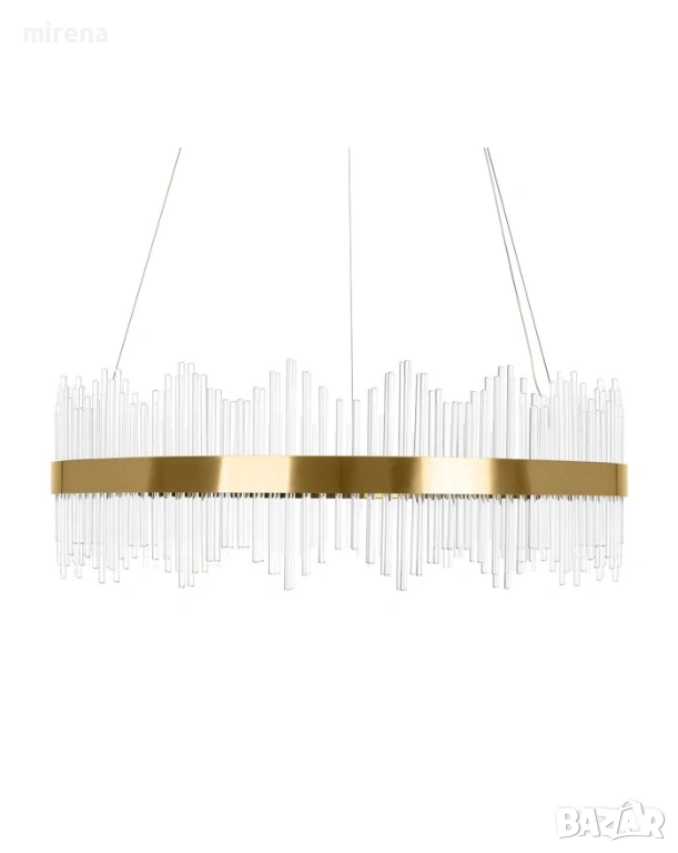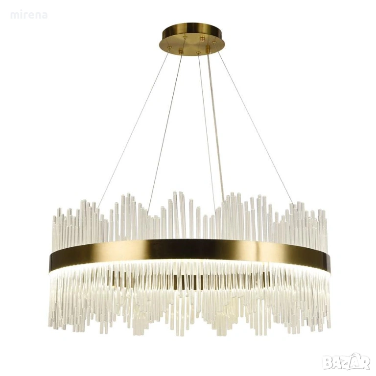 Елегантен и модерен полилей с кристални висящи елементи, създаващи впечатляващ светлинен ефект. Подходящ за осветяване на трапезарии, хотелски лобита или други просторни помещения. Окачен на 100 см дълъг метален кабел с златист цвят.