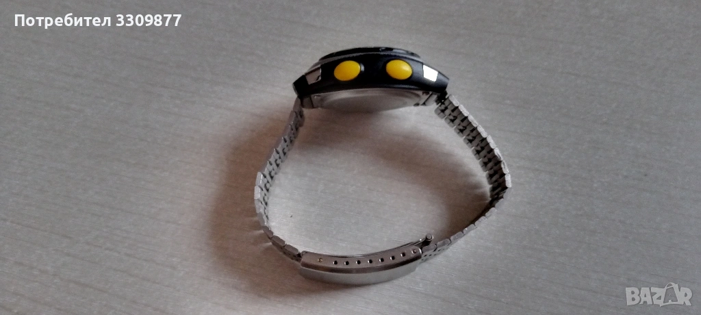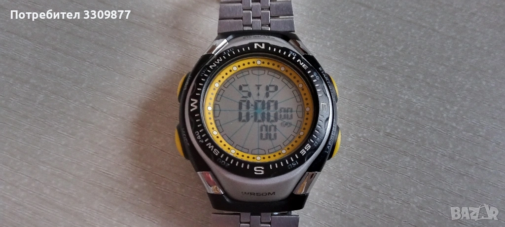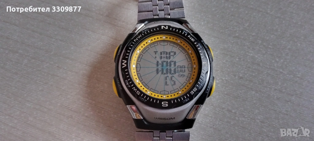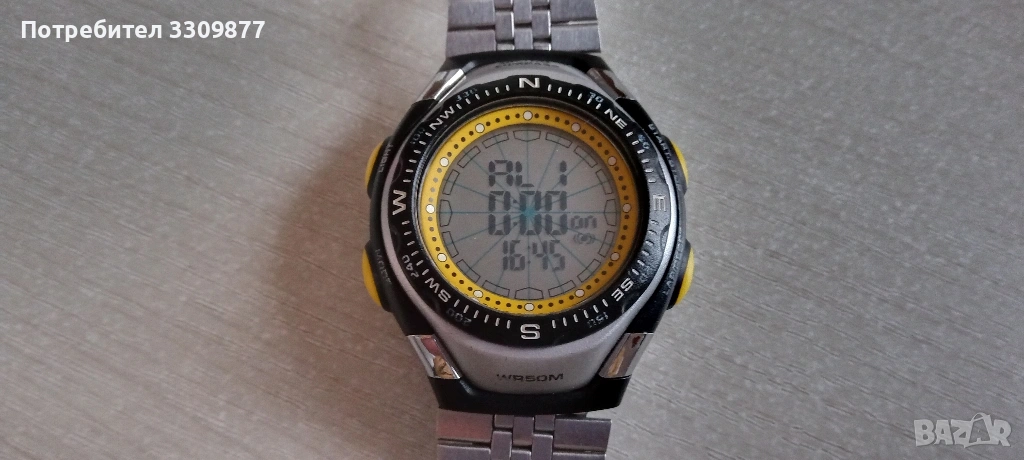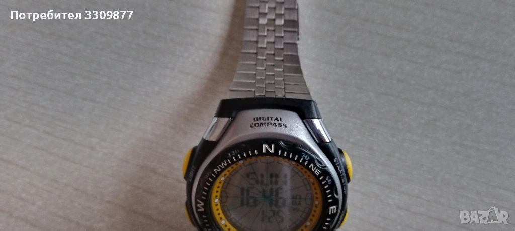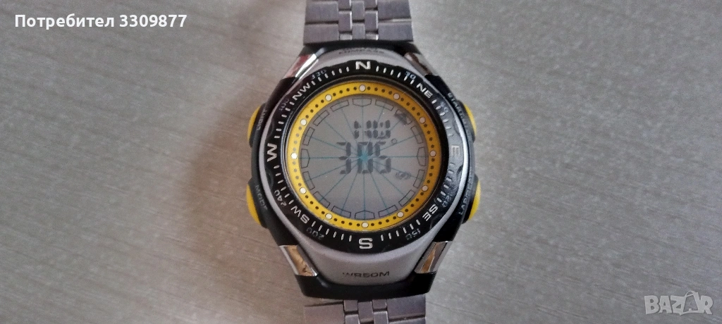 Електронен часовник с дигитален компас - часовникът и функциите му работят перфектно. Има нормални следи от употреба. Часовникът разполага с аларма, календар, хронометър, таймер, второ време, дигитален компас и осветление на дисплея. Също така безелът на часовника се върти.