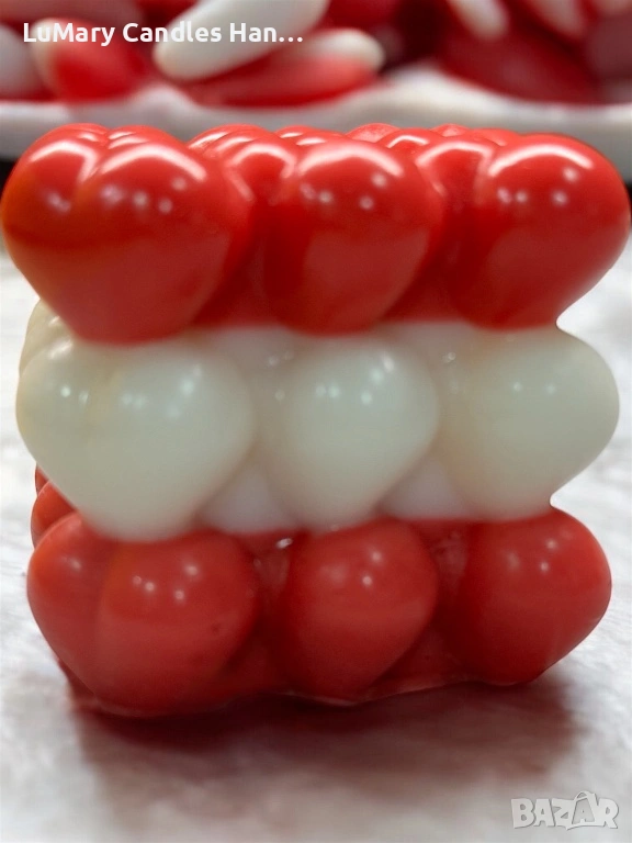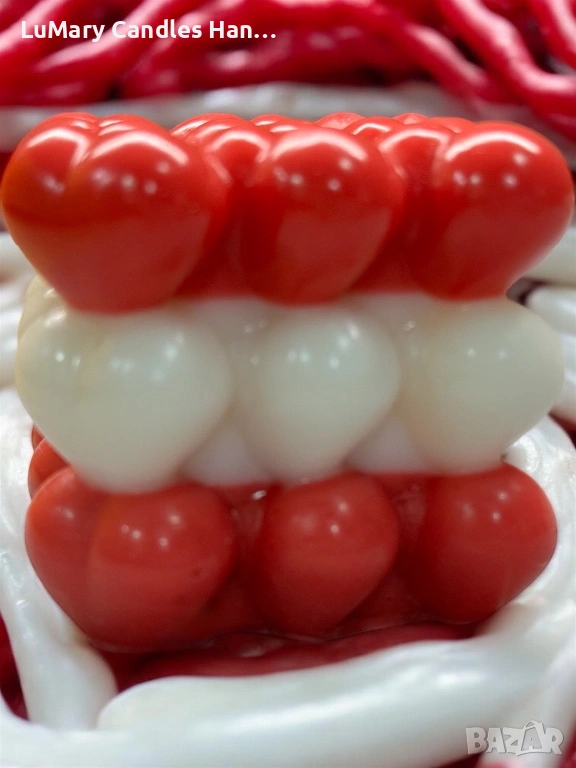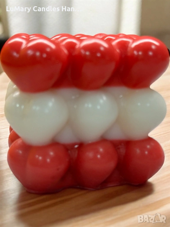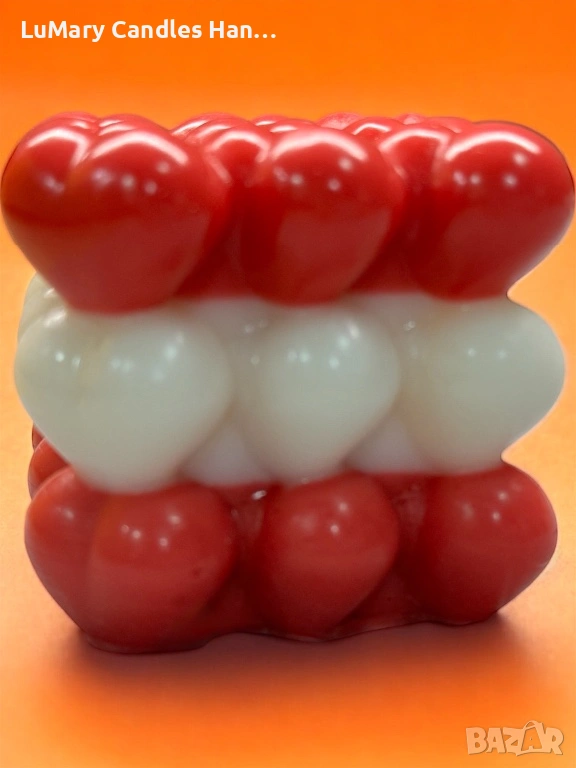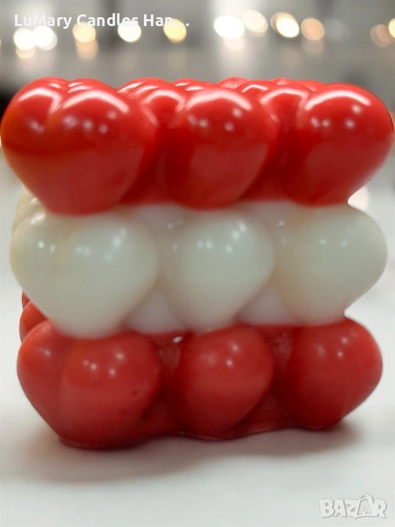 Изградена от нежно подредени сърца, тази декоративна свещ символизира близост, топлина и споделени моменти.