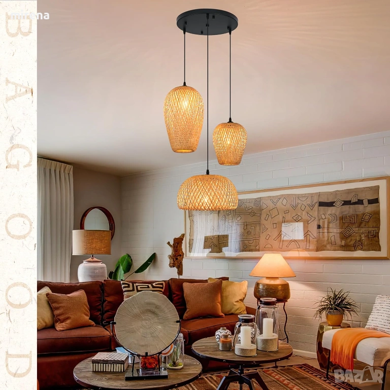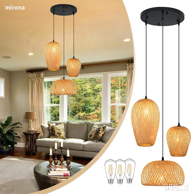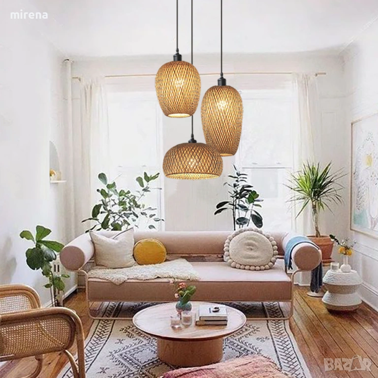 Лампа от ратан с 3 лампи, бамбук, бохо стил, ръчно плетени полилеи