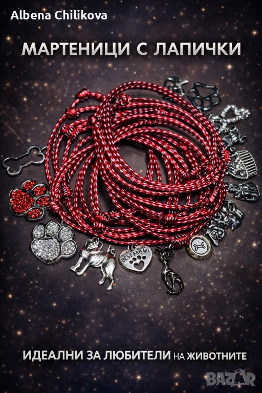 Предлагам общо 650бр. мартеници,от които 200бр. естествена вълна с резинови животинки,45бр. със стъклени мурано сърца и 405бр. от полиестерен конец(имитация на кожа,не задържа вода) с различни видове висулки и стягащи възли(подходящи за всяка ръка).Всички са опаковани.