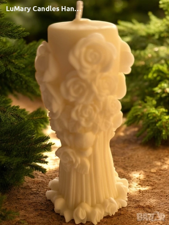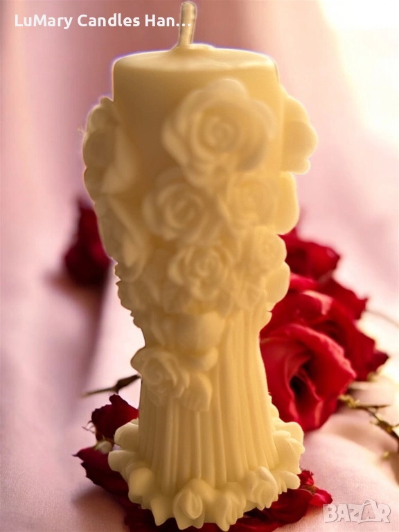 Изваяна в меко бяло и нежни рози, тази свещ носи усещане за чистота, любов и тиха красота.