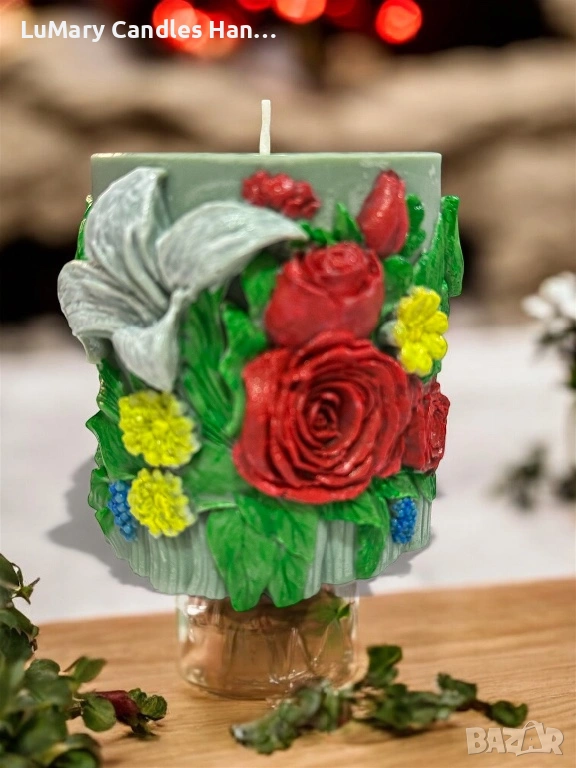 Тази декоративна свещ съчетава богати флорални елементи и наситени цветове, които носят усещане за живот, радост и естествена красота.