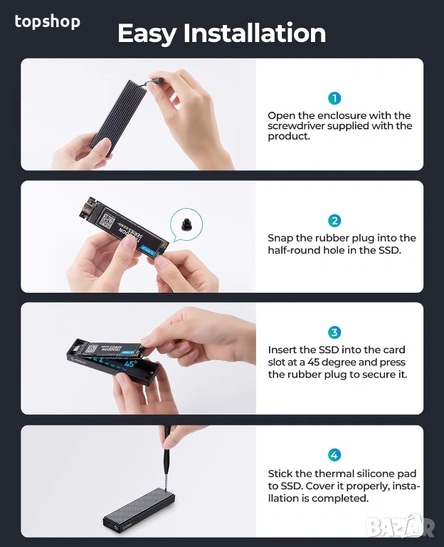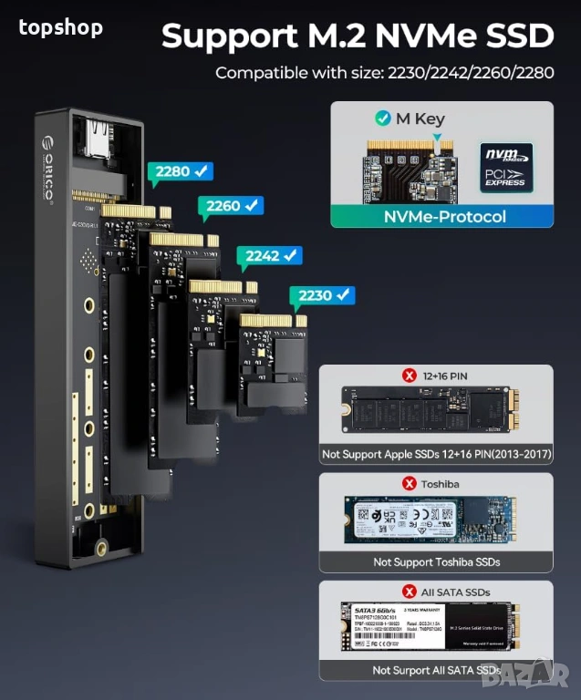 Важно: Кутията поддържа само NVMe (PCIe) дискове. Не е съвместима с по-старите M.2 SATA дискове.