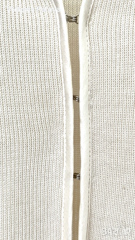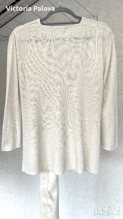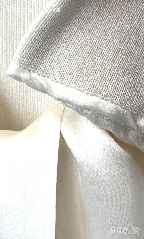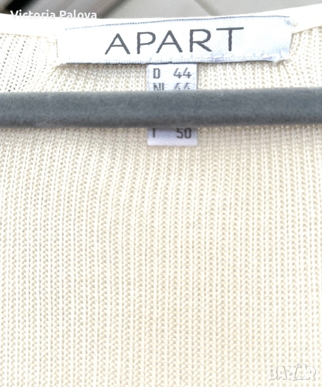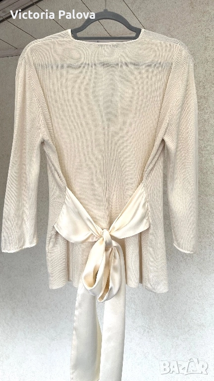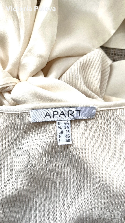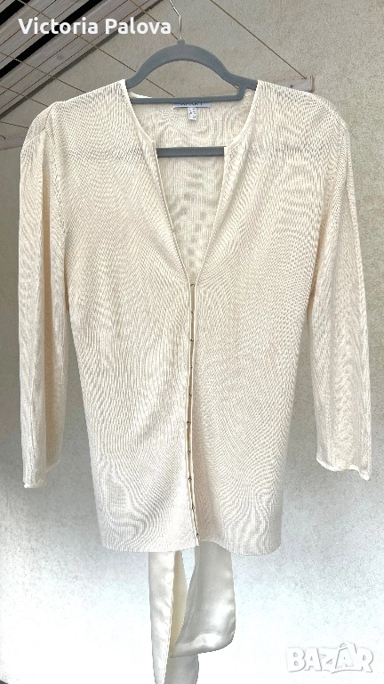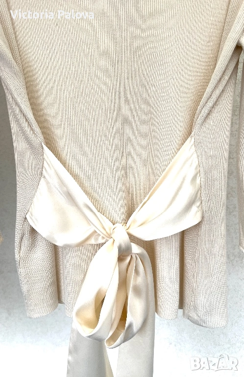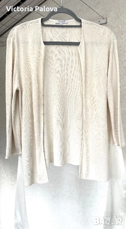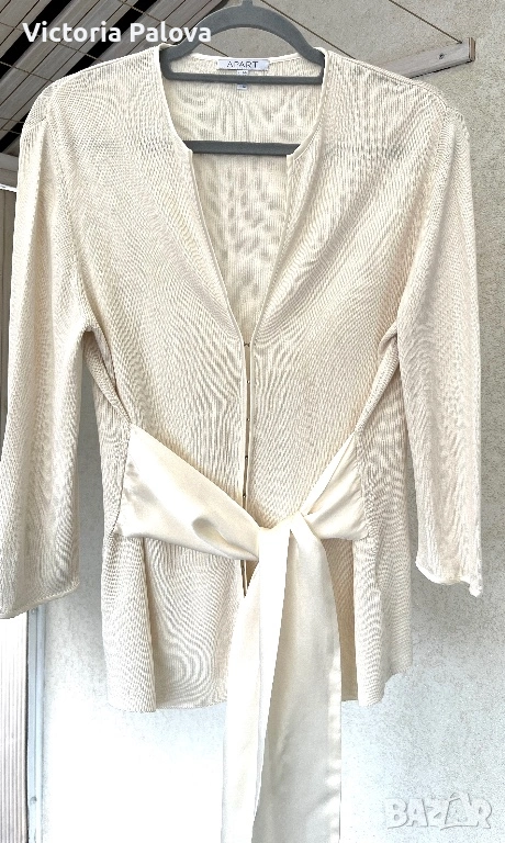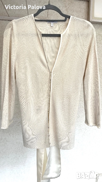 Елегантна жилетка от немска модна марка APART - скъп бранд, известен с женствени силуети, премиум материи и внимание към всеки детайл. APART създава дрехи за жени , които търсят изисканост, класа, лукс без показност. 55% естествена коприна , вертикално плетиво, нежен луксозен цвят. Абсолютният акцент са копринените ленти, които могат да се връзват по различни начини - на пандела, свободно , асиметрично или стегнато - според визията и настроението. Жилетката е с отчетливо дизайнерско присъствие и усещане за висока мода. Рамо - 46см, ГО - 56см, дължина - 65см, ръкав - 47,5см.