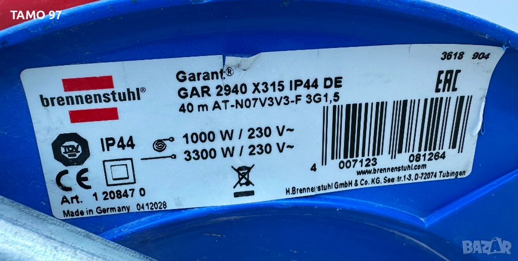 2. Brennenstuhl Garant AT-N07V3V3-F 3G1.5mm² IP44 1000W-3300W / 230V с 3 гнезда 40 метра - 60евро