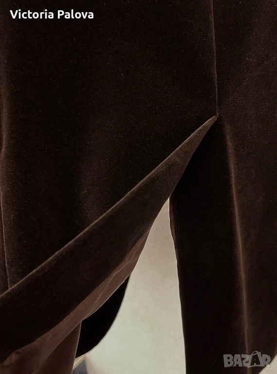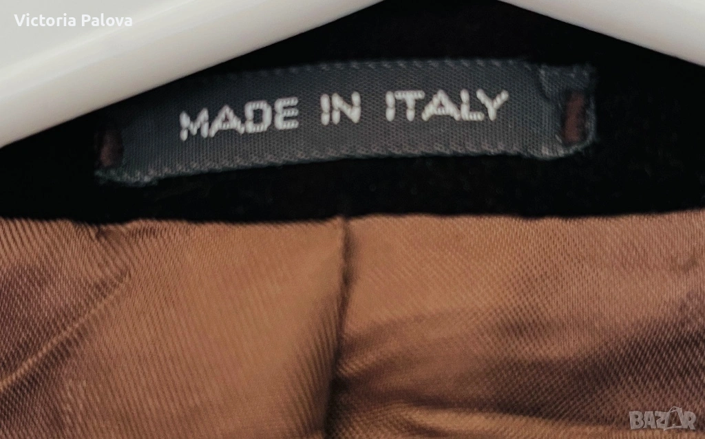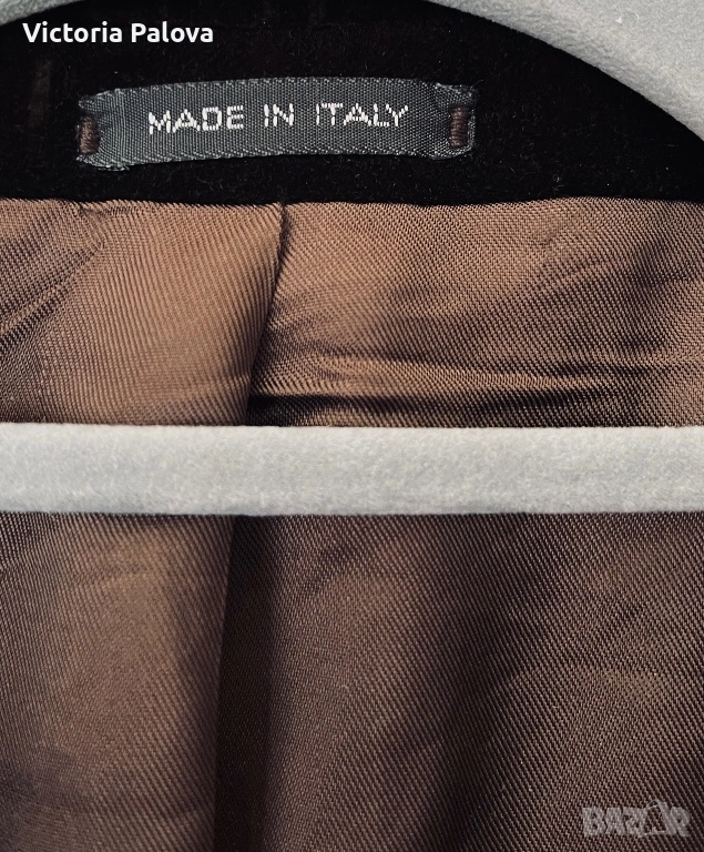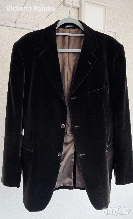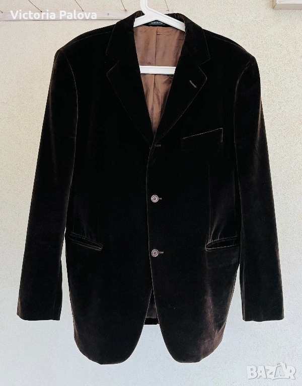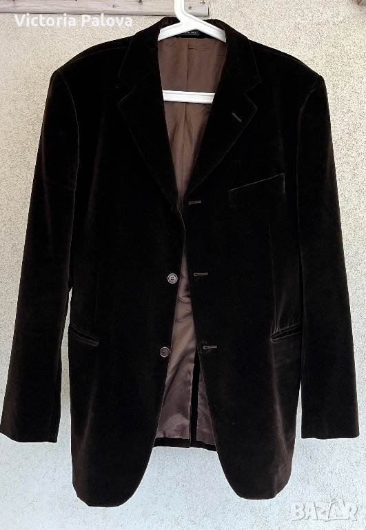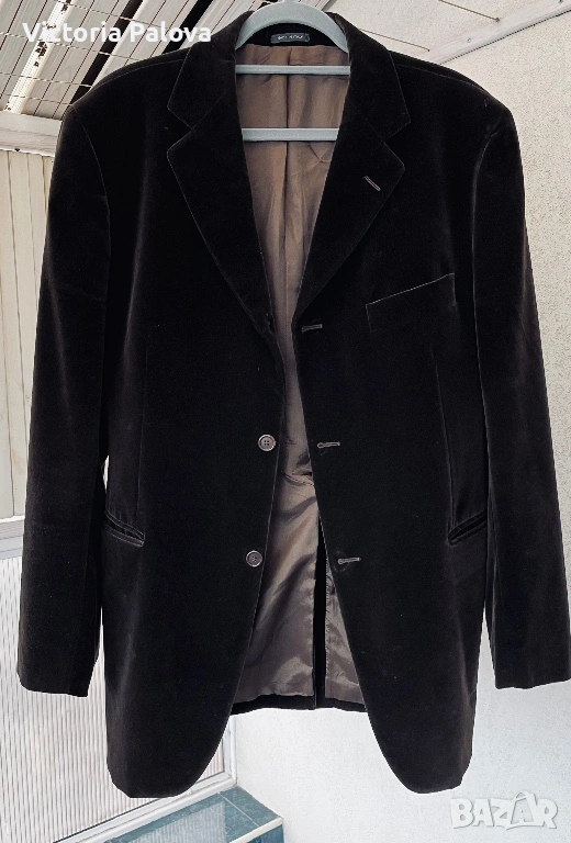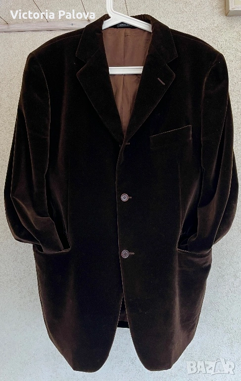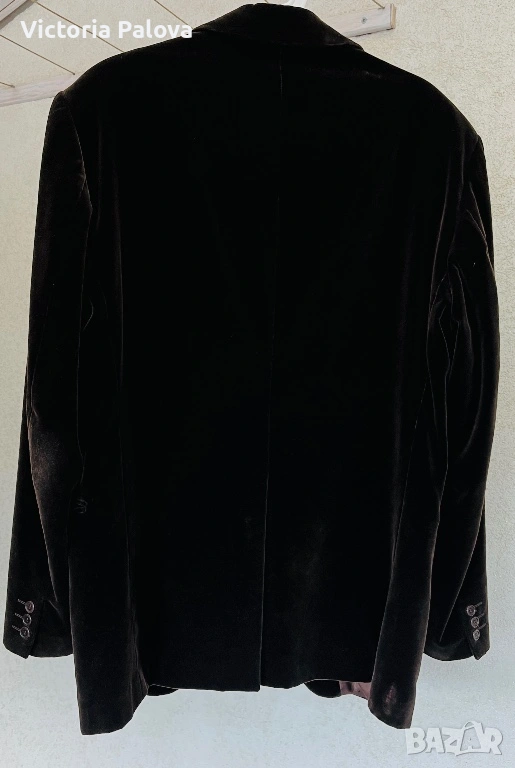 Истински шедьовър на елегантност и изтънченост, изключително рядко срещано изделие, изработено от премиум кадифе с богата текстура, което прелива в невероятно красив цвят на горчив шоколад - дълбок, наситен и с лек блясък, който улавя светлината по уникален начин. Класическата кройка включва леки подплънки на раменете за перфектна форма и структура, три копчета отпред, функционални джобове и безупречни детайли, подчертаващи италианското майсторство. Произведено изцяло в Италия, то гарантира най-високо качество и вечен стил, идеално за официални събития , гала вечери, партита или за изискан casual look , който впечатлява. Рамо - 50см, ГО - 58см, дължина - 82см, ръкав - 65,5см, шлиц - 29см.