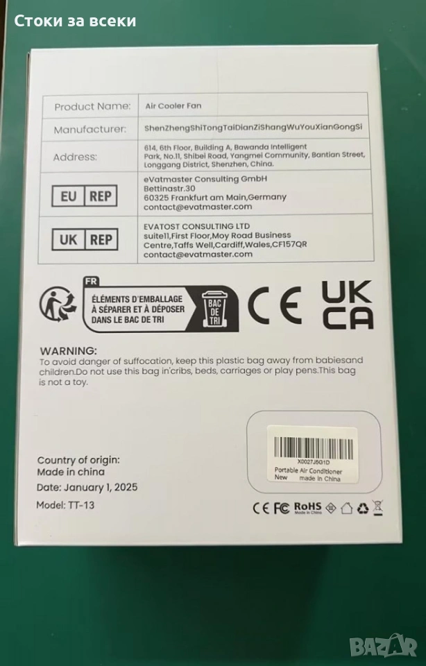 2 бр. Интелигентен мини климатик 4 в 1 – мобилно охлаждане без компромис: без маркучи, без монтаж, с 3 нива на мощност Марка: AJVV; Модел: TT-13; Размери на продукта: 13 x 20 x 27 см.; Тегло: 882 гр.; Енергийна ефективност: НЕ; Ефективност (10 клас): A+++ до G; Капацитет: 1250 милилитра; Годишна консумация на енергия: 200 ватчаса; 3 скорости; Таймер: 1/2/3 часа; Цветни LED светлини; Ниво на шум: 35 dB; Специални функции: Регулируемо острие на 60°, LED управление на светлината, преносим, таймер, изход за вода отдолу; Цвят: Бял; Гаранция: 12 месеца.