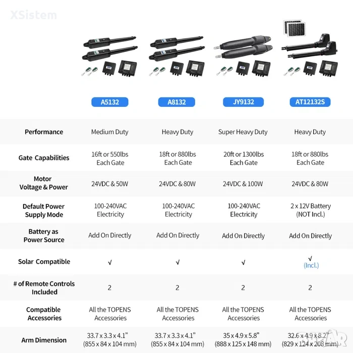 TOPENS A5132 Двоен отварач за врати, среднотоварен автоматичен мотор за двойни врати, до 16 фута на рамо, електрически задвижващ механизъм за алея, захранван от променлив ток с комплект за дистанционно управление, съвместим със слънчева енергия