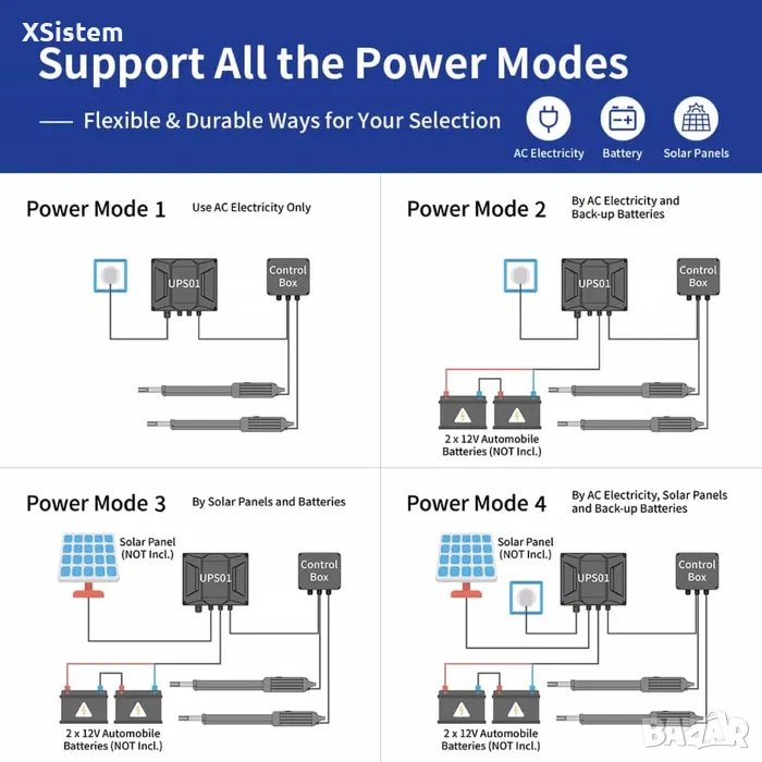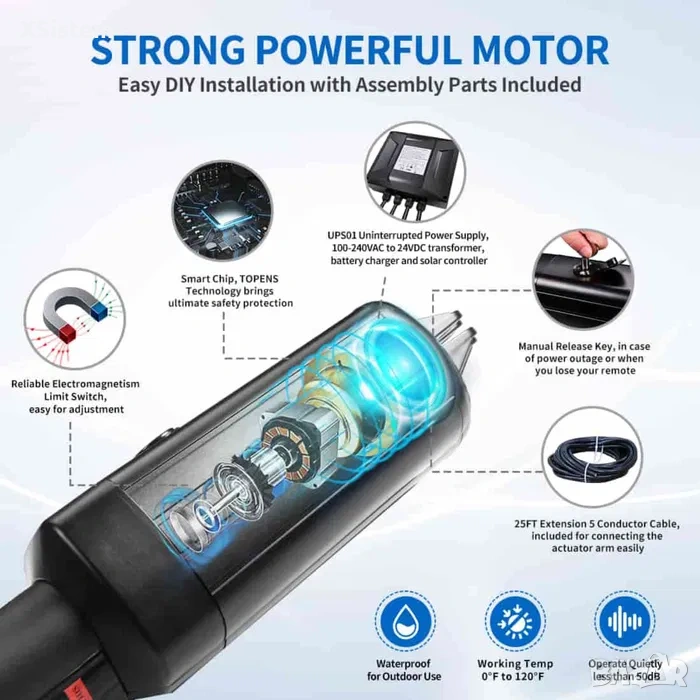 Този отварач за порти може да се захранва от 100-240 VAC електричество или от 24V 12Ah автомобилна/морска батерия.