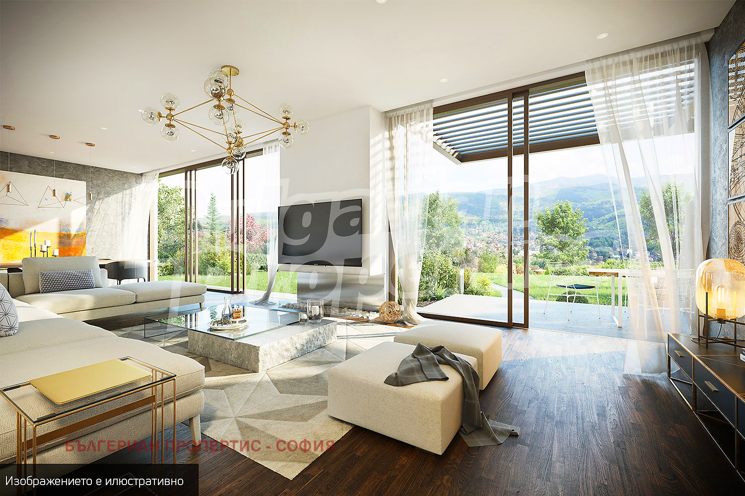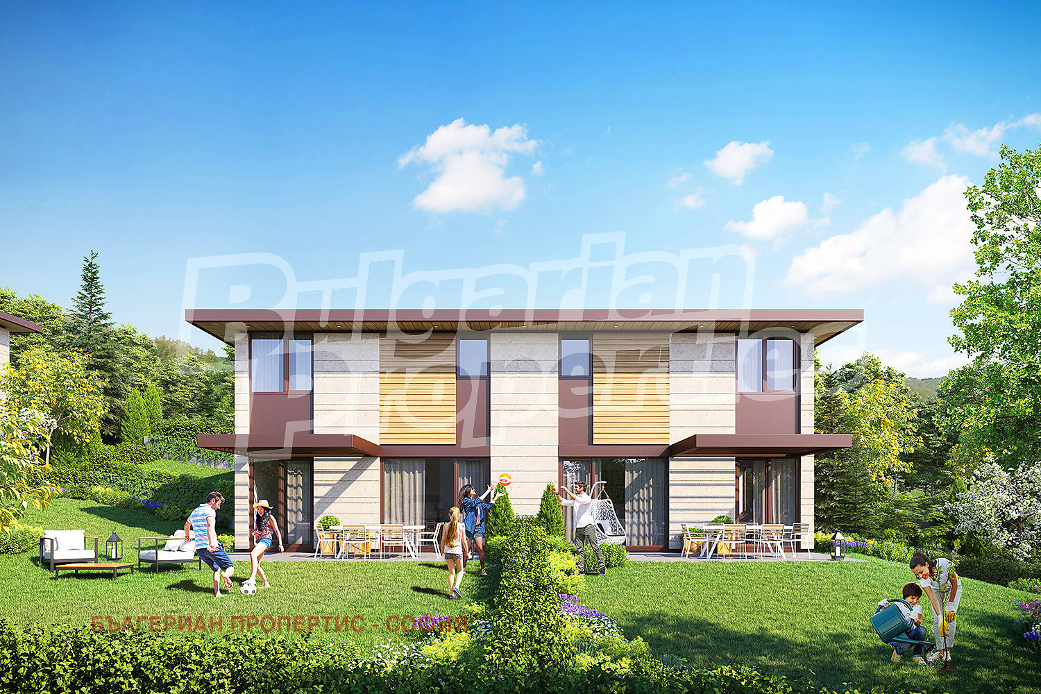 Максимално остъклените фасадни стени на жилищните помещения и просторните зелени дворове, явяващи се естествено продължение на интериорните пространства, са изцяло подчинени на концепцията за функционална и спокойна жилищна среда, която естествено и непринудено функционира в единство с природата! Къщите са разгърнати ветрилообразно, всяка една с изложение на всички жилищни помещения изцяло насочени и отворени към панорамата на Витоша. Във функционално отношение къщите са сходни с малки различия по отношение на терена и реда, на който са разположени.