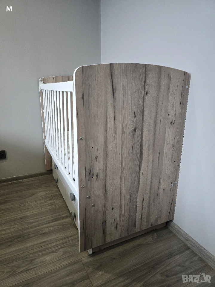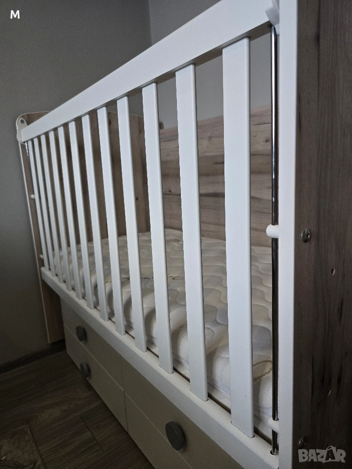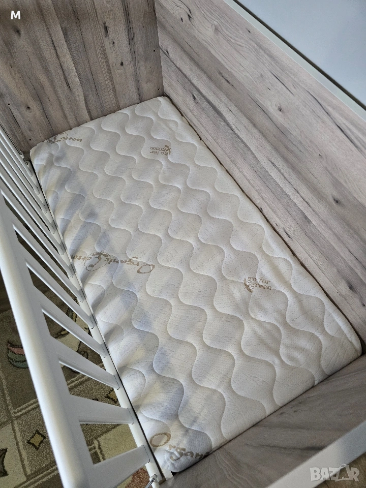 Бебешка кошара / легло с подвижна решетка на три нива в цвят- северен дъб+бял + матрак. Закупена е от Nicolle Baby. Без забележки.