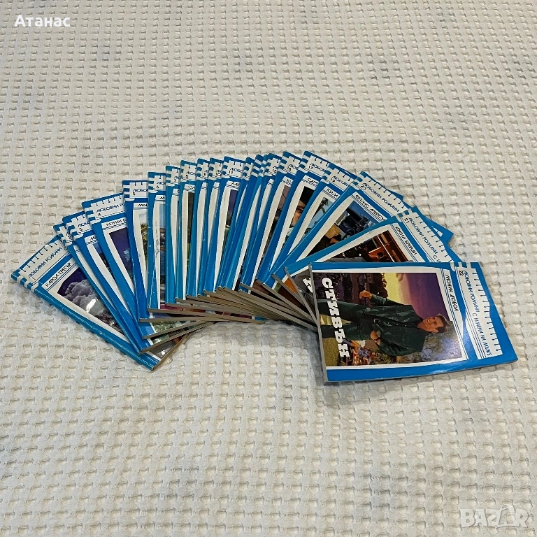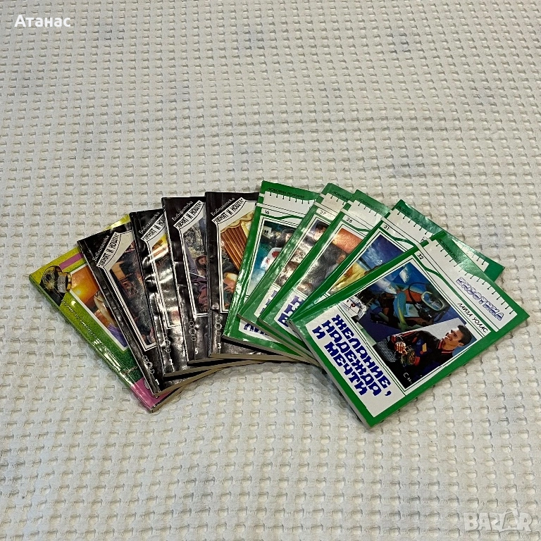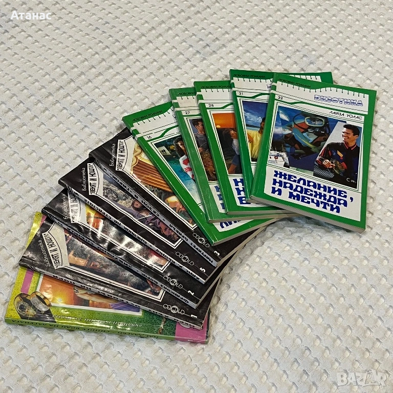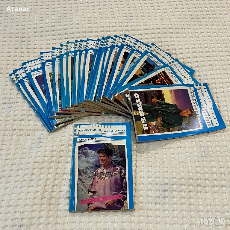 Колекция книги “Любовни романи с имена на мъже”. Общо количество 21броя (от 1 до 22, липсва 18) + 10 книги в сходна тематика и формат, издавани в периода 1992-1995, състояние добро.