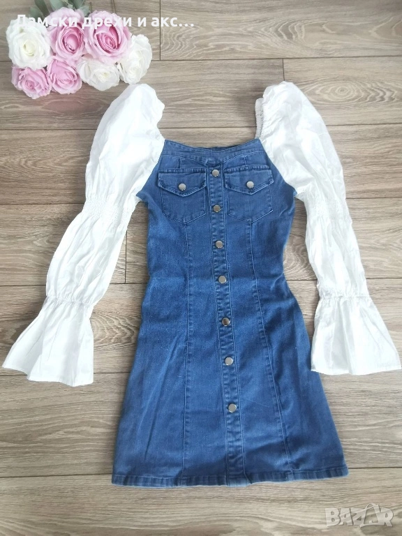 Модерна дънкова рокля с бели ръкави → Обява 53227610