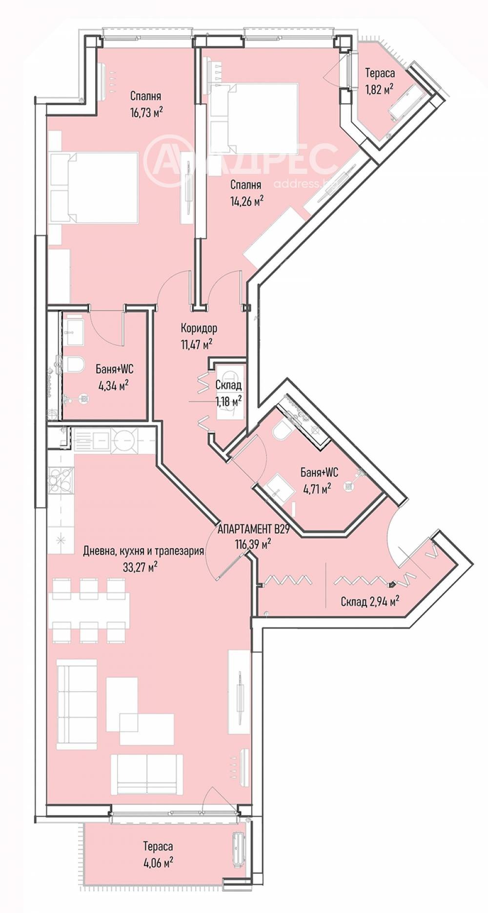 Тристаен апартамент с обща площ от 149.01 кв.м. Разположен е на седми етаж. Състои се от: антре, дневна с кухненски бокс и трапезария, две спални, две бани и две тераси. Изложението е север-юг. Отоплението е на ТЕЦ. Има възможност за покупка на паркомясто или гараж. Очаквана дата за завършване на комплекса края на 2025 год.