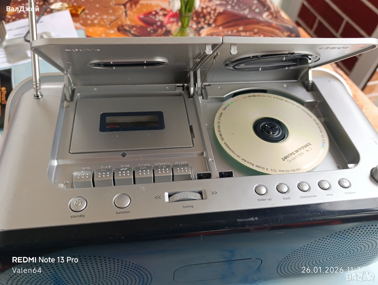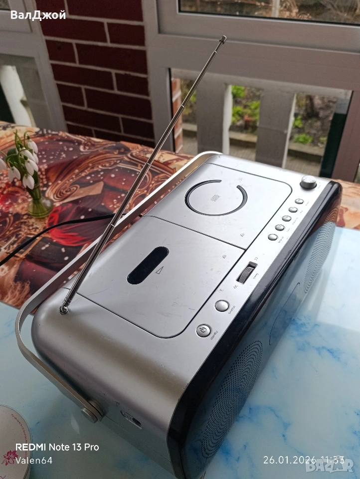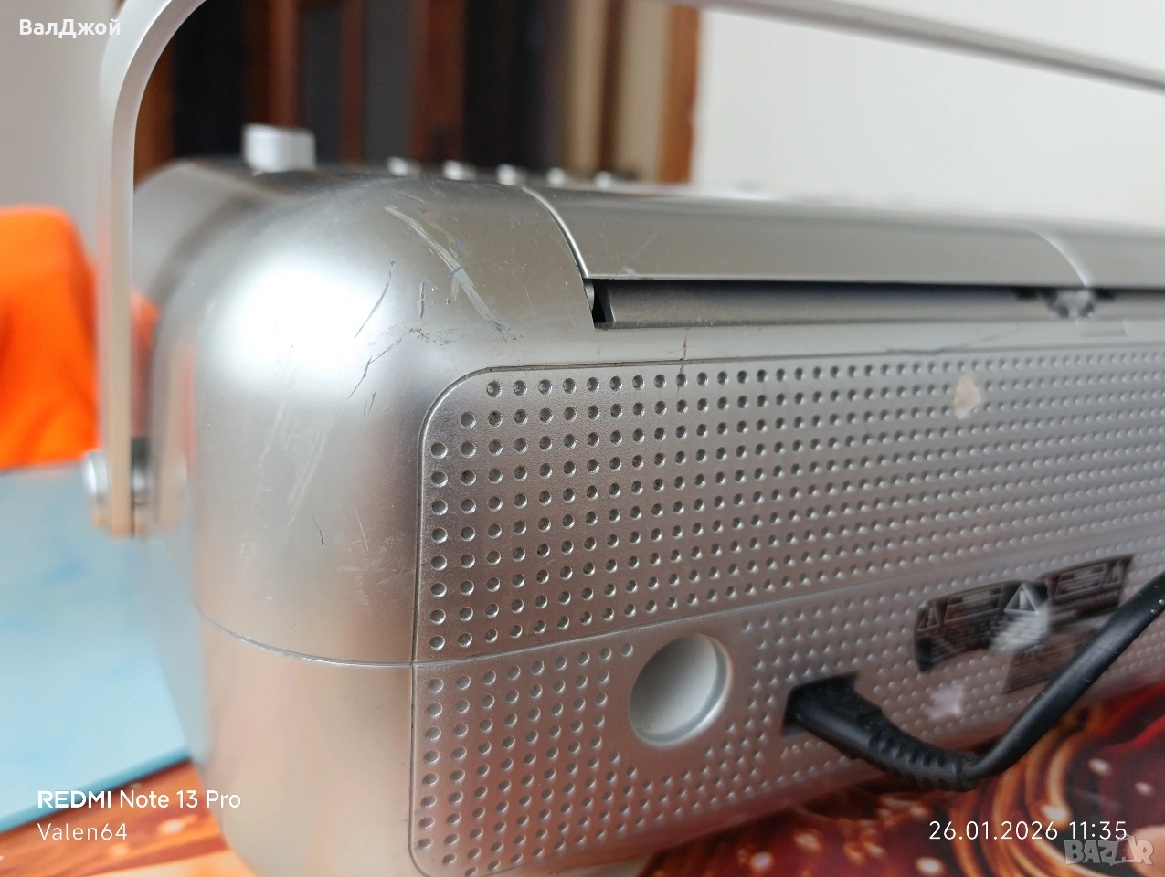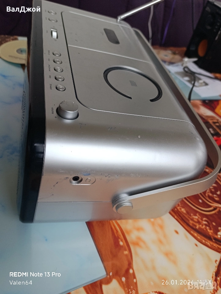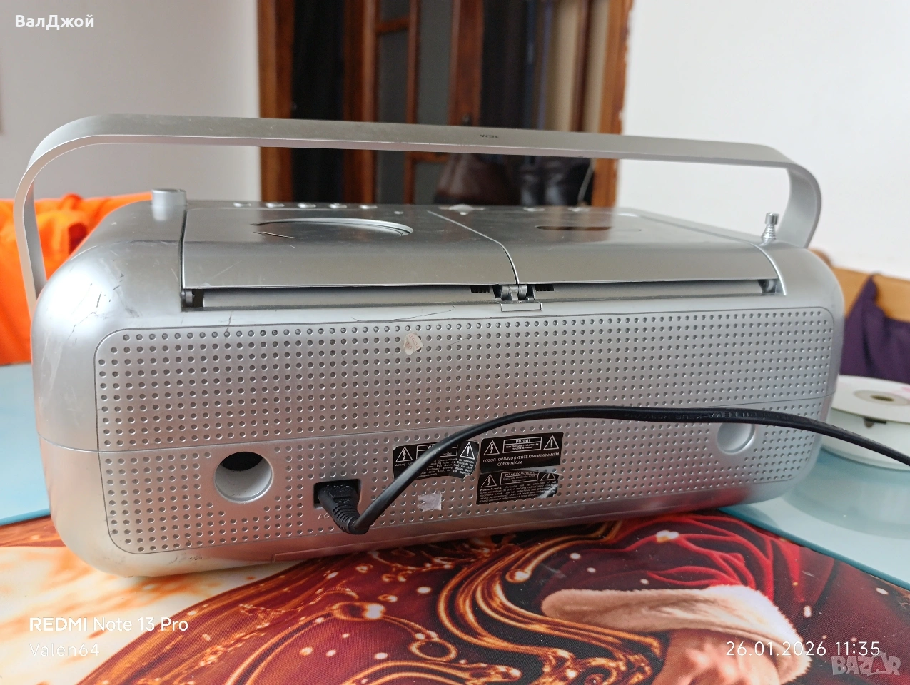 работи на радио на касета и на диск.. леки външни забележки виждат се на снимките.. здрава метална дръжка.. цяла антена.. на касетката ремъците сменени.. единия ремък малко по-стегнат затова не работи перфектно на касета.. но се слуша добре. при интерес ще изпратя видео как работи по viber. пращам с преглед и тест...41/20/16см.