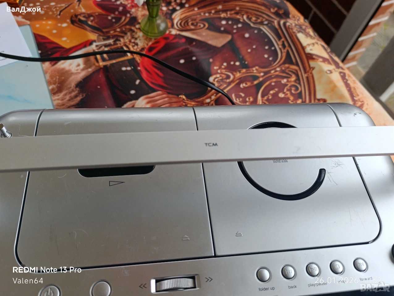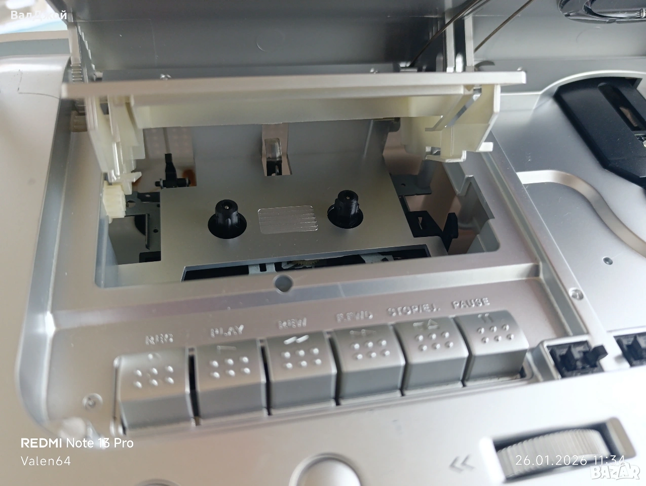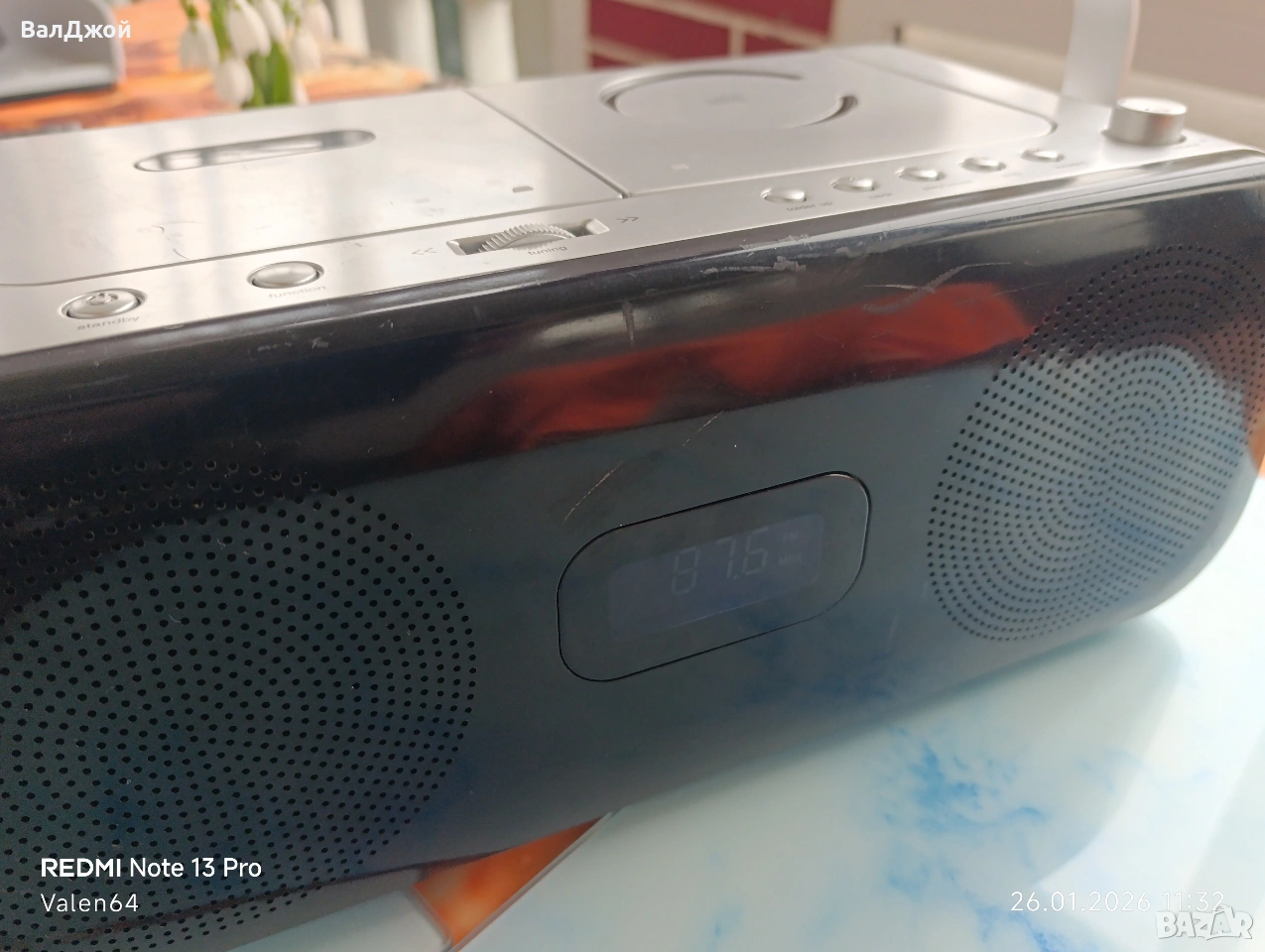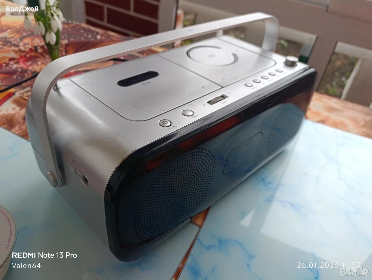 работи на радио на касета и на диск.. леки външни забележки виждат се на снимките.. здрава метална дръжка.. цяла антена.. на касетката ремъците сменени.. единия ремък малко по-стегнат затова не работи перфектно на касета.. но се слуша добре. при интерес ще изпратя видео как работи по viber. пращам с преглед и тест...41/20/16см.