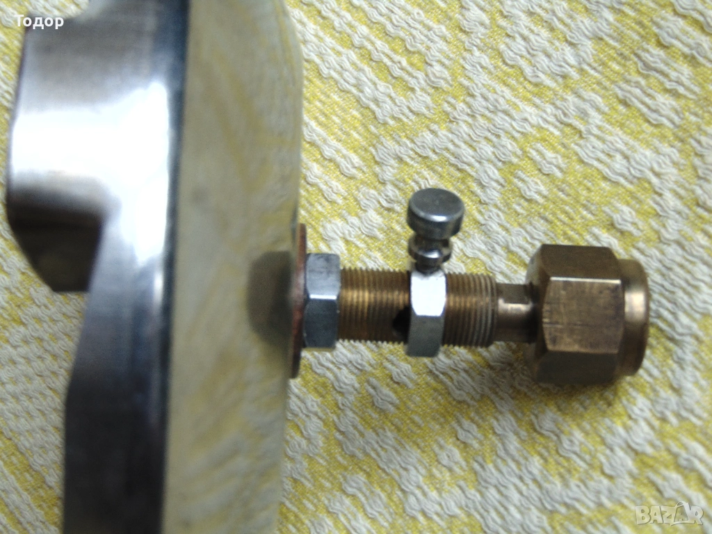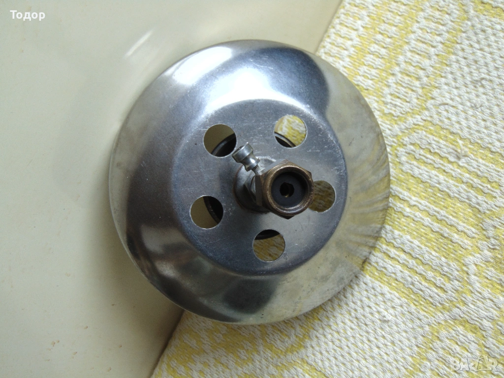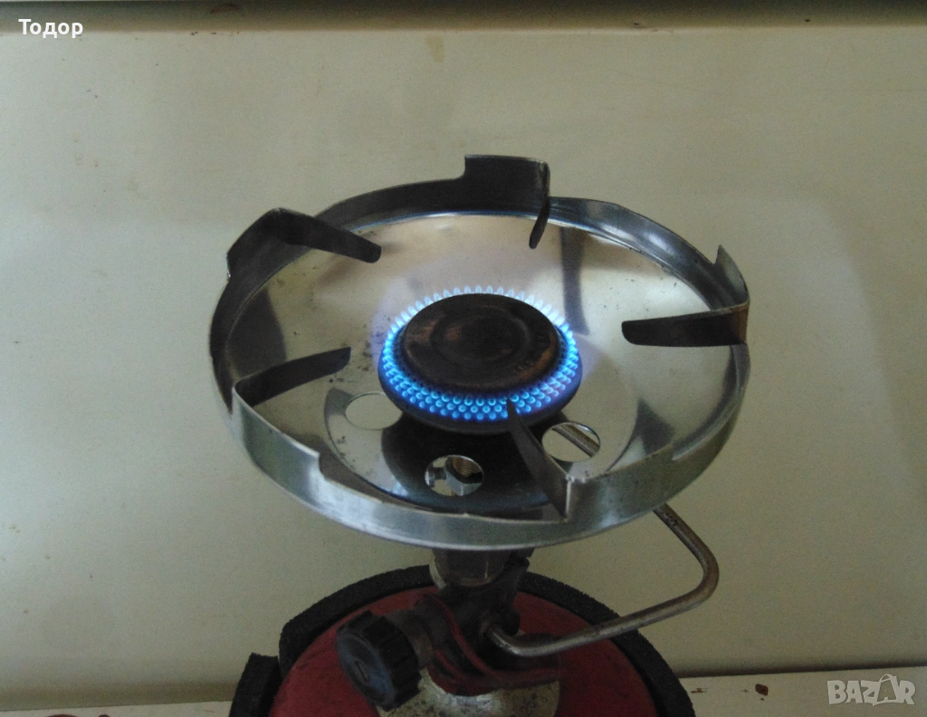 Месингова гъбка, тавичка неръждавейка. Работи с български и полски туристически газови бутилки с присъединителна резба 3/8G лява. В много добро състояние, работи без забележки.