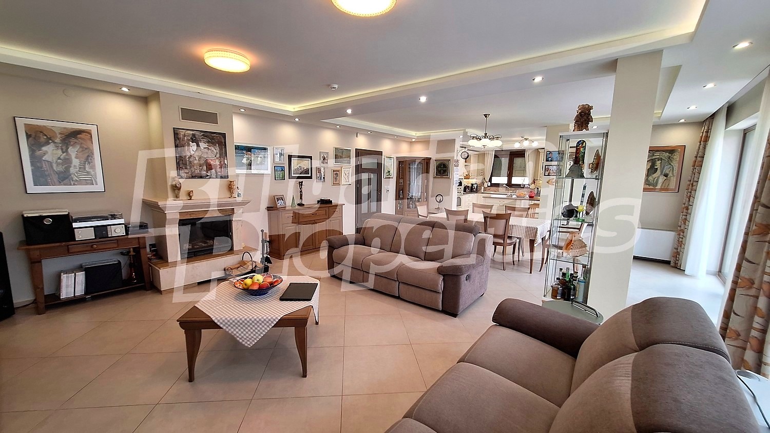 Първият етаж впечатлява с просторна дневна с класическа камина с каменна облицовка, трапезария и напълно оборудвана кухня с немско обзавеждане CELINA и уреди TEKA. Към кухнята има отделно складово помещение. На етажа са разположени още тоалетна, перално и котелно помещение. Подовите настилки са от гранитогрес, таваните са окачени с топлоизолация и декоративно осветление. Дневната разполага с подово отопление и конвектори за отопление и охлаждане, а по цялата ѝ дължина са изградени панорамни прозорци с два изхода към верандата и градината. Верандата е оборудвана с автоматизирани сенници, което я прави идеално място за отдих през всички сезони.