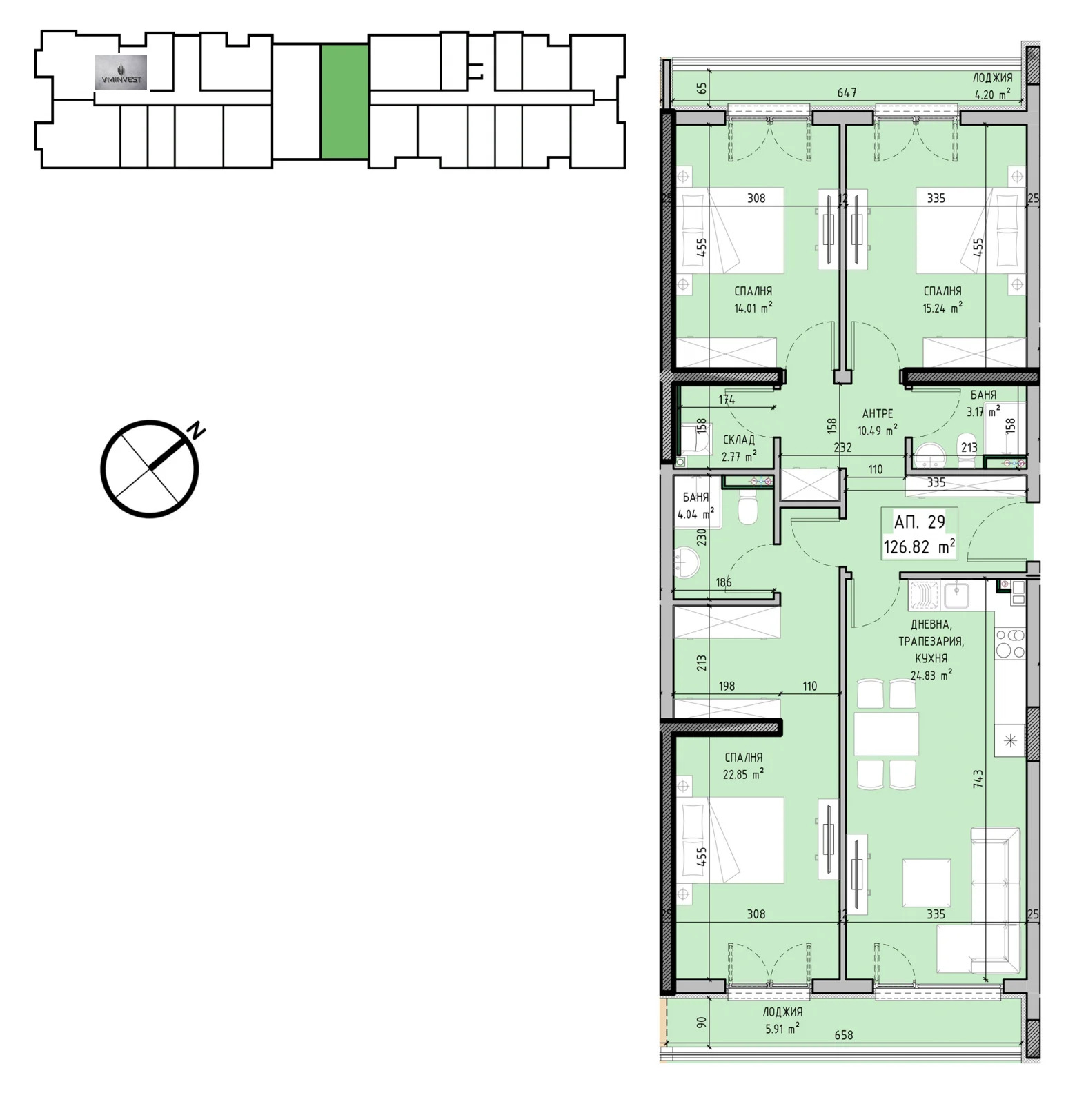 Разпределение: антре /10,49 кв.м./, дневна с кухненски бокс /24,83 кв.м./, спалня /14,01 кв.м./, втора спалня /15,24 кв.м./, трета спалня с дрешник /22,85 кв.м./ и с баня с тоалетна към нея /4,04 кв.м./,втора баня с тоалетна /3,17 кв.м./ складово помещение /2,77 кв.м./ и две лоджии /5,81 кв.м. и 4,20 кв.м./.