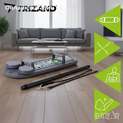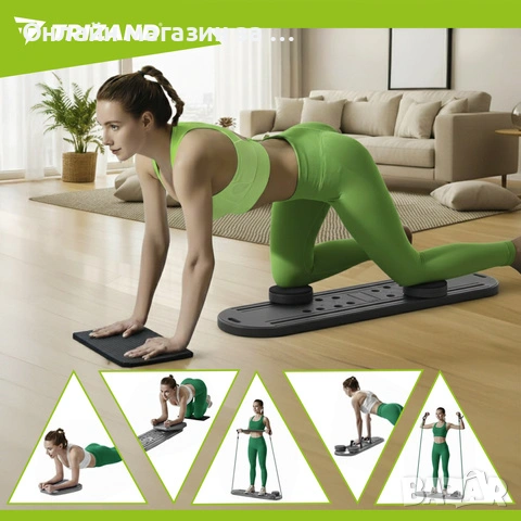 Многофункционалната дъска за пилатес TRIZAND е цялостно тренировъчно оборудване, което съчетава функциите на реформер, дъска за баланс, платформа за планки, колело за коремни упражнения, дръжки за лицеви опори и ленти за съпротива. С помощта на тази дъска можете да изпълнявате пълна гама от упражнения – от лицеви опори и клякания, през изпадания, до пилатес и стречинг. Тя ви позволява да тренирате цялото си тяло у дома, във фитнеса и на открито – без да се нуждаете от много място или допълнителни аксесоари . Идеална за тези, които искат да укрепят мускулите на корема, да отслабнат и да подобрят подвижността си.