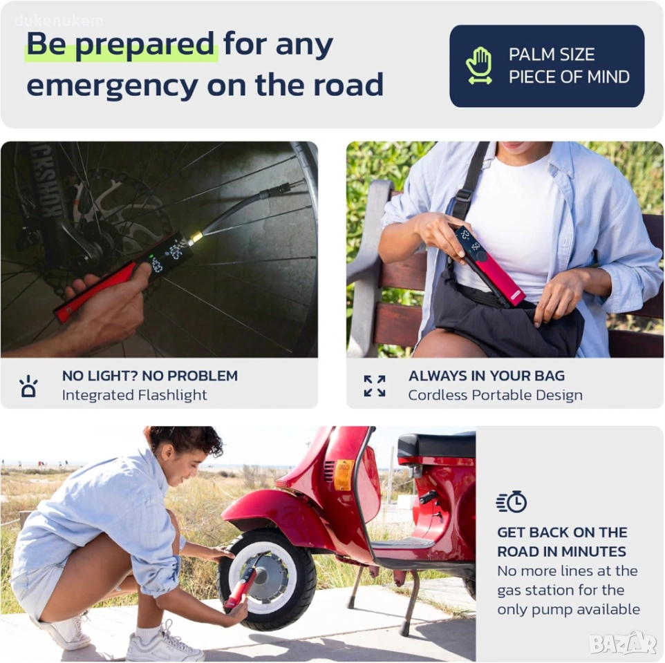 Подходяща за велосипеди, електрически велосипеди, мотори, скутери, автомобилни гуми, както и за топки и надуваеми аксесоари