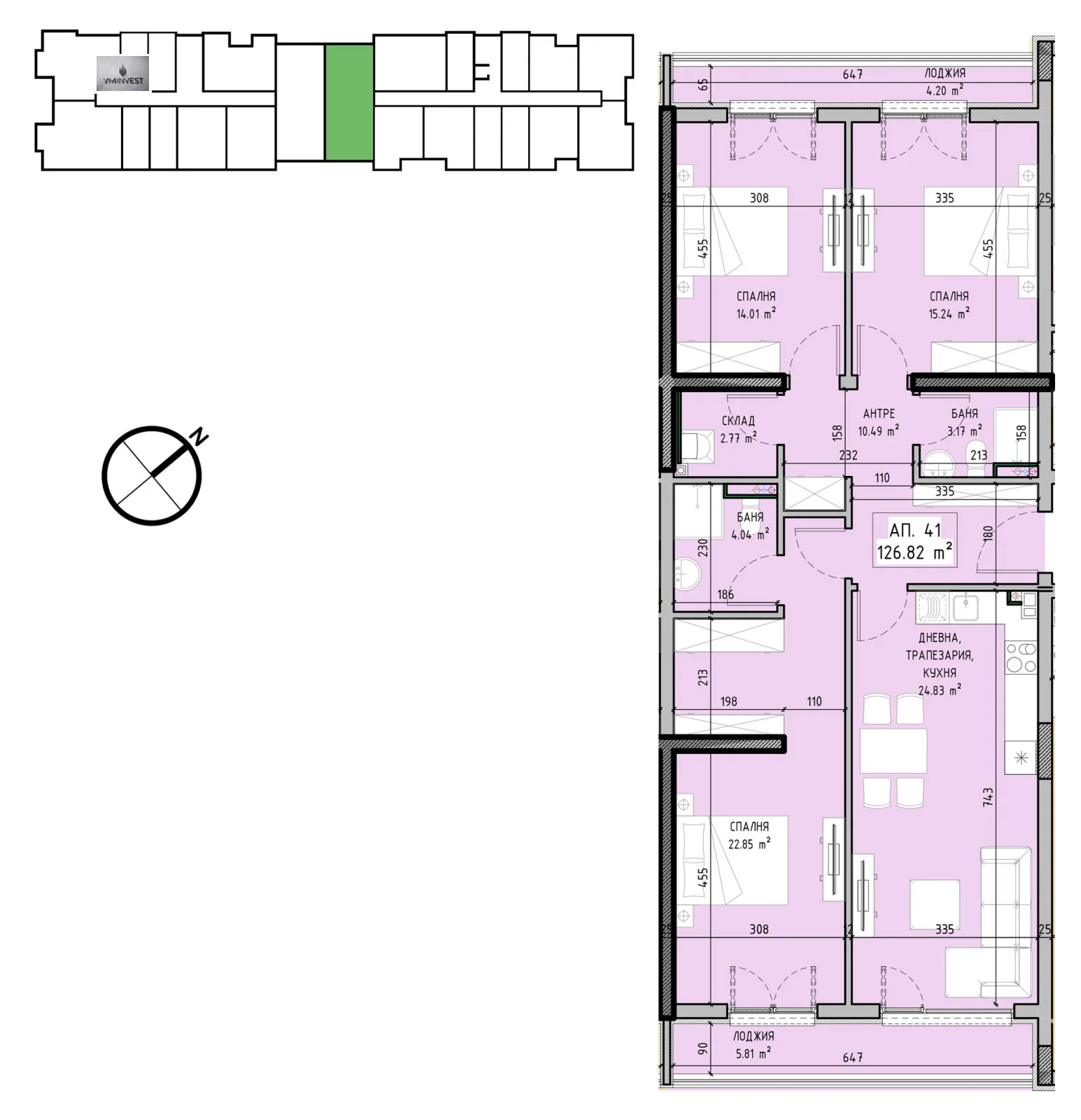 Разпределение: антре /10,49 кв.м./, дневна с кухненски бокс /24,83 кв.м./, спалня /14,01 кв.м./, втора спалня /15,24 кв.м./, трета спалня с дрешник /22,85 кв.м./ и с баня с тоалетна към нея /4,04 кв.м./,втора баня с тоалетна /3,17 кв.м./ складово помещение /2,77 кв.м./ и две лоджии /5,81 кв.м. и 4,20 кв.м./.