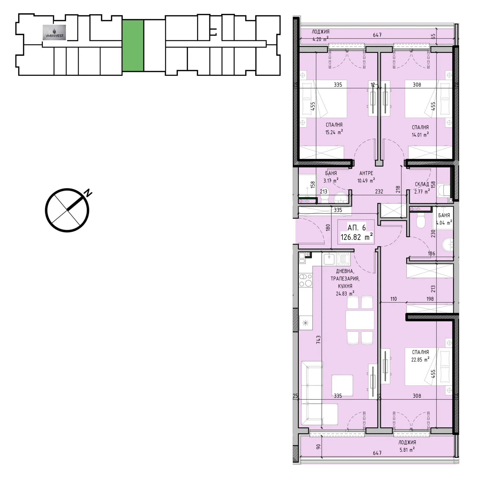 Разпределение: антре /10,49 кв.м./, дневна с кухненски бокс /24,83 кв.м./, спалня /14,01 кв.м./, втора спалня /15,24 кв.м./, трета спалня с дрешник /22,85 кв.м./ и с баня с тоалетна към нея /4,04 кв.м./,втора баня с тоалетна /3,17 кв.м./ складово помещение /2,77 кв.м./ и две лоджии /5,81 кв.м. и 4,20 кв.м./.
