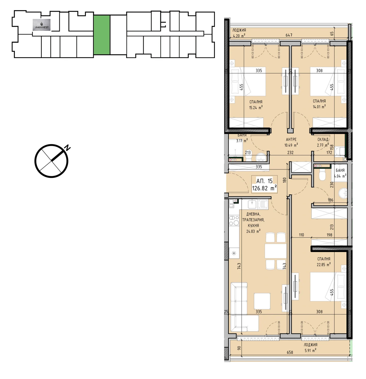 Разпределение: антре /10,49 кв.м./, дневна с кухненски бокс /24,83 кв.м./, спалня /14,01 кв.м./, втора спалня /15,24 кв.м./, трета спалня с дрешник /22,85 кв.м./ и с баня с тоалетна към нея /4,04 кв.м./,втора баня с тоалетна /3,17 кв.м./ складово помещение /2,77 кв.м./ и две лоджии /5,81 кв.м. и 4,20 кв.м./.