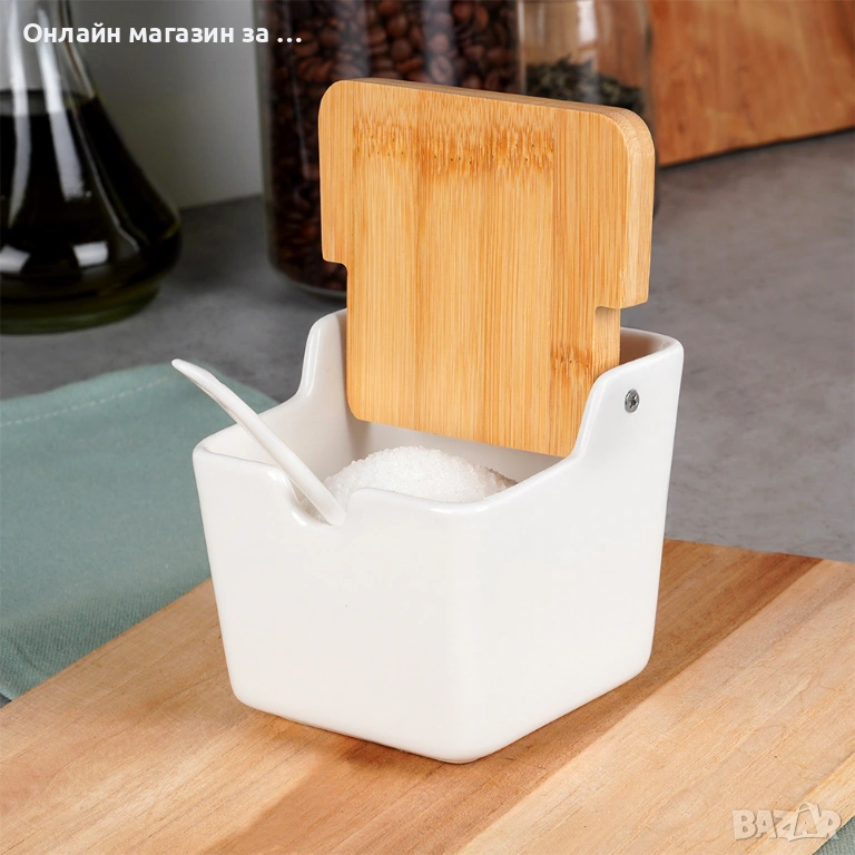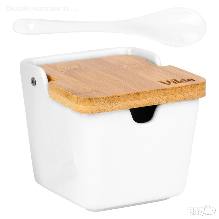 - Изработена от керамика и бамбук - Захарницата и лъжичката са изработени от висококачествена бяла керамика. Капакът е изработен от бамбуково дърво. При правилна употреба ще ви служи дълги години.