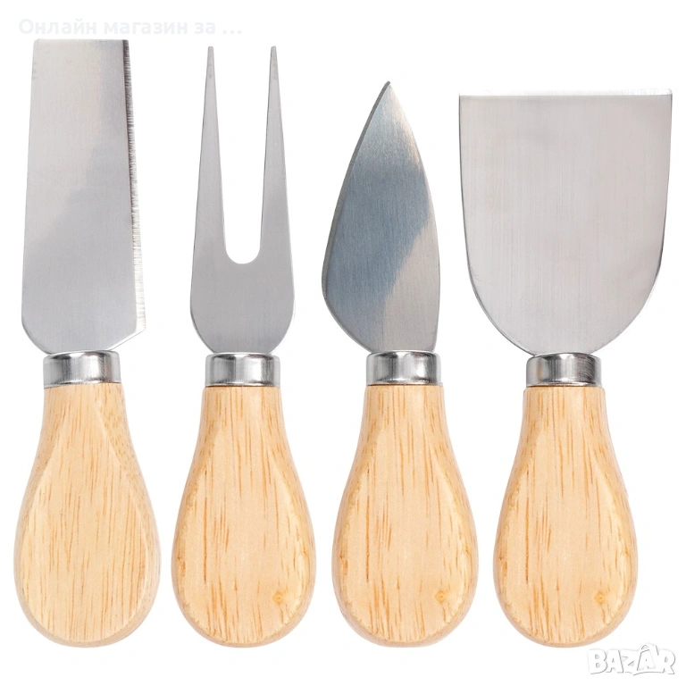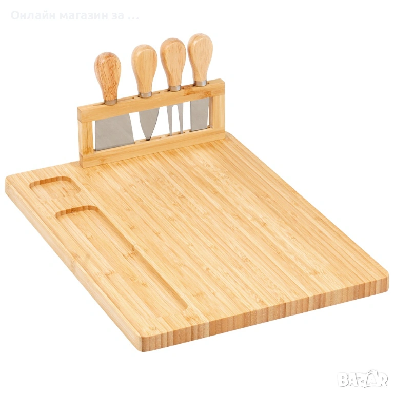 Бамбукова дъска за сирена с магнитна лента,върху която са поставени 4 бр. различни ножове 139753