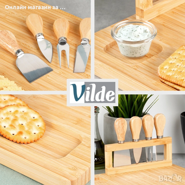Тава за сервиране на сирене с ножове. Тавата е изключително впечатляваща, идеална за семейни събирания, партита или важни церемонии. С нейна помощ можем да подредим по оригинален начин сирена или други закуски. Тавата е чудесна идея за подарък за любителите на сиренето и не само. Лесна за почистване и употреба. Подходяща за домашна употреба, както и за заведения за хранене. Изработена от безопасни за здравето и неутрални към храната материали. Оригинален продукт на Vilde. Произведена в съответствие с европейските стандарти.