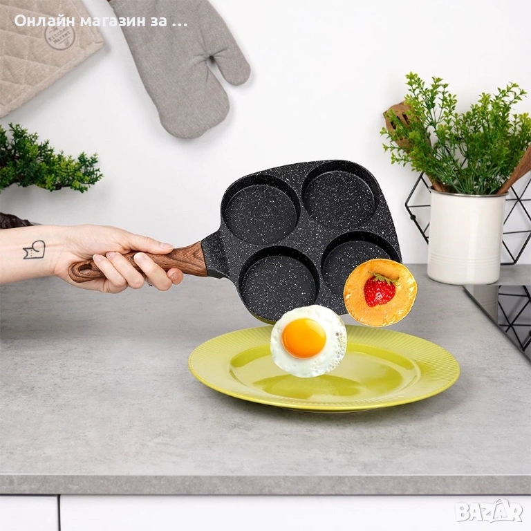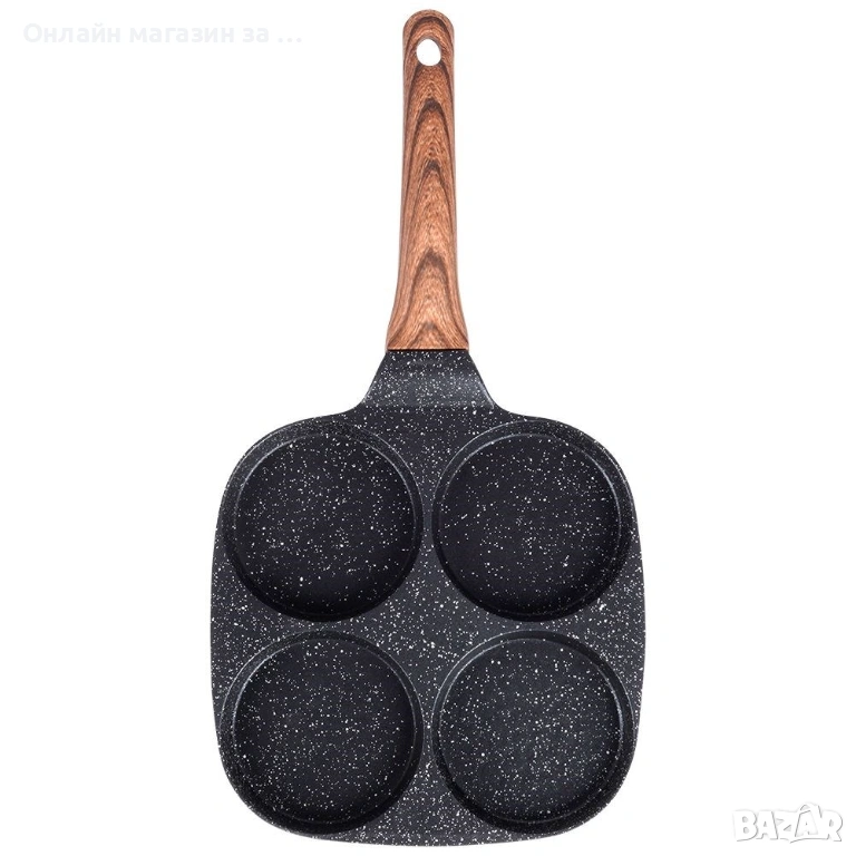 - ПОЛЕЗНО - Перфектната тиган за приготвяне на яйца на очи и палачинки. Тиганът от серията Black&Wood с размери 19 x 19 cm и четири специални отвора с диаметър 8,5 cm позволява да се приготвят ястия с перфектна форма. Външни размери: дължина 36,5 cm, височина на тигана 2 cm, височина с дръжка 5 cm.