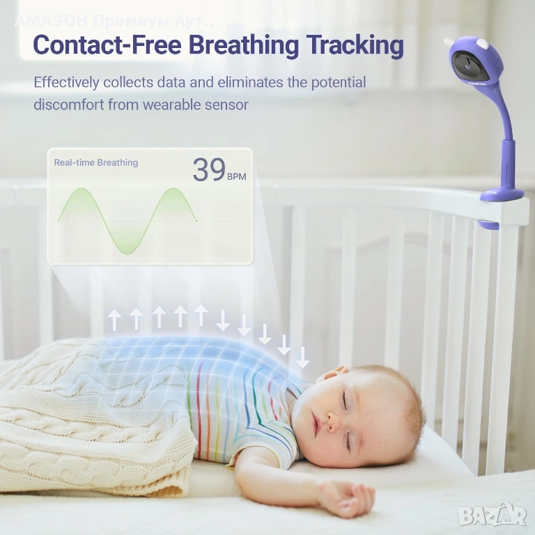 Безконтактно наблюдение на дишането и съня: Усъвършенстваната технология с изкуствен интелект улавя и анализира дишането и моделите на сън на вашето бебе без контакт, осигурявайки необезпокоявана почивка. Получавайте известия в реално време без абонамент.