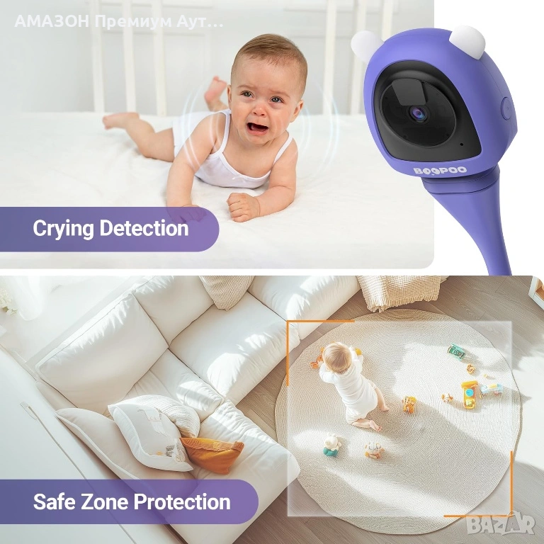 Разпознаване на плач/пресичане/безопасна зона и двупосочно аудио: Точно разпознава плача, проследява движенията и задава безопасни зони за известия. Двупосочното аудио ви позволява да чувате и успокоявате бебето си незабавно.
