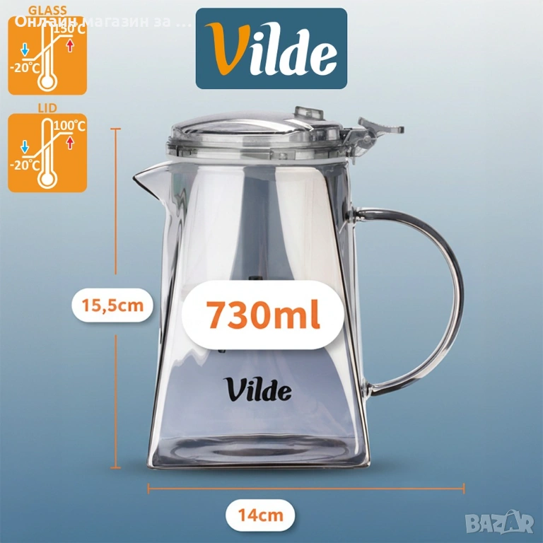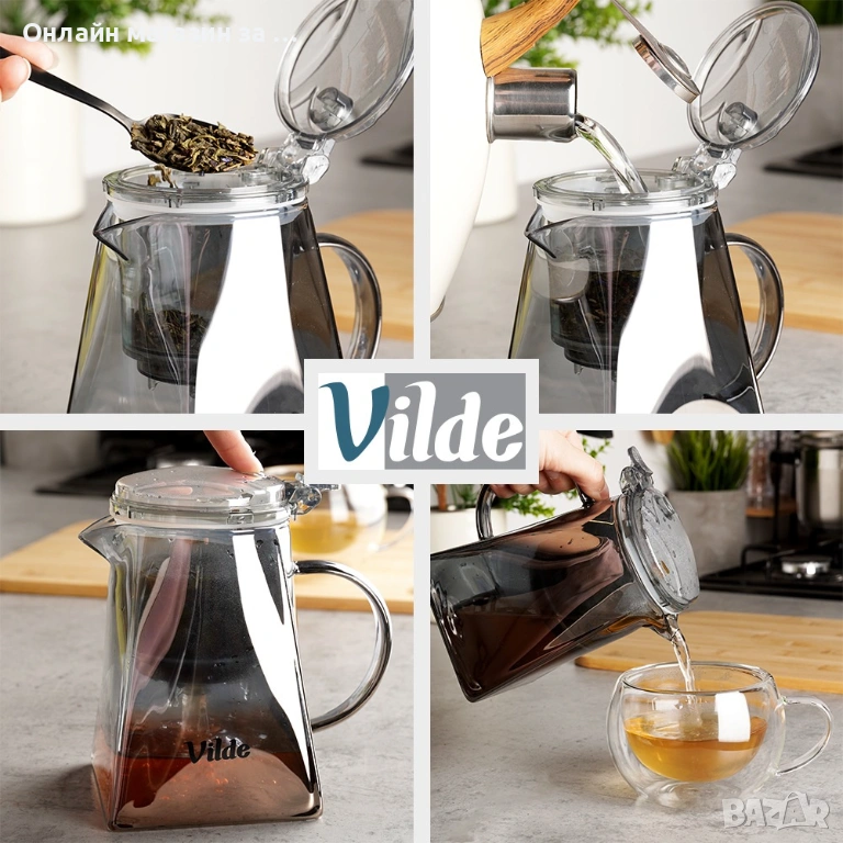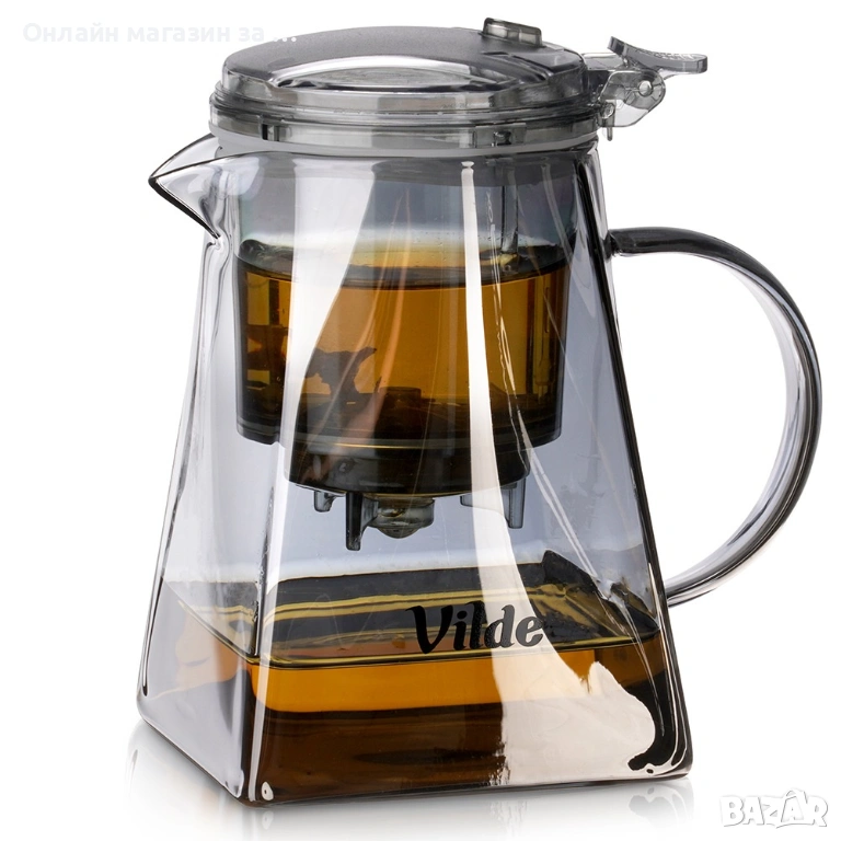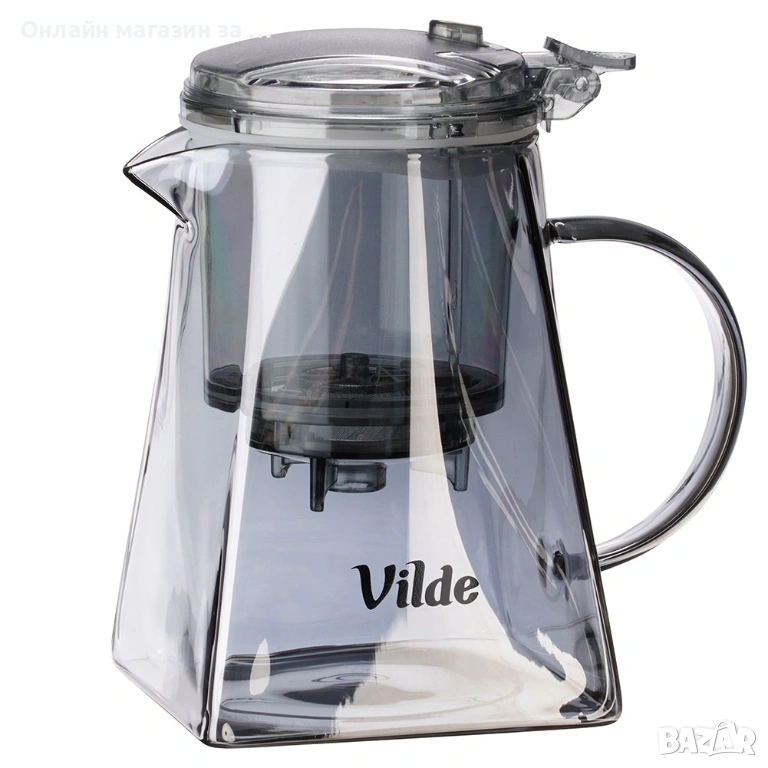 Стъкленият чайник с инфузер е идеално и компактно решение за приготвяне на чай и билки. Чайникът е снабден с уникална система за освобождаване, която ви позволява да контролирате силата на аромата и веднага да приготвите друга порция. Благодарение на тази система и устойчивостта си на екстремни температури, този чайник е изключително удобен и универсален за ежедневна употреба. Оригинален продукт на марката Vilde. Произведен в съответствие с европейските стандарти.