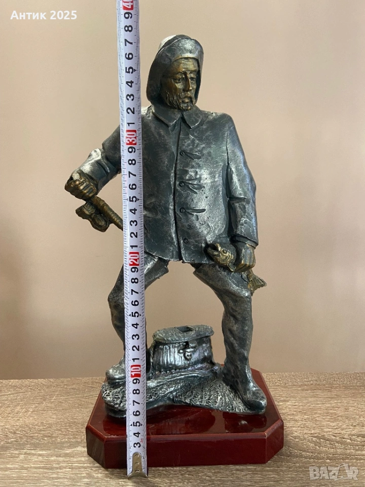 Винтажна алуминиева статуетка „Рибар с въдица“, върху червена основа → Обява 53231239