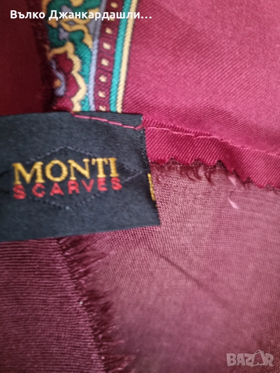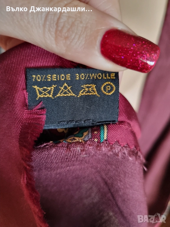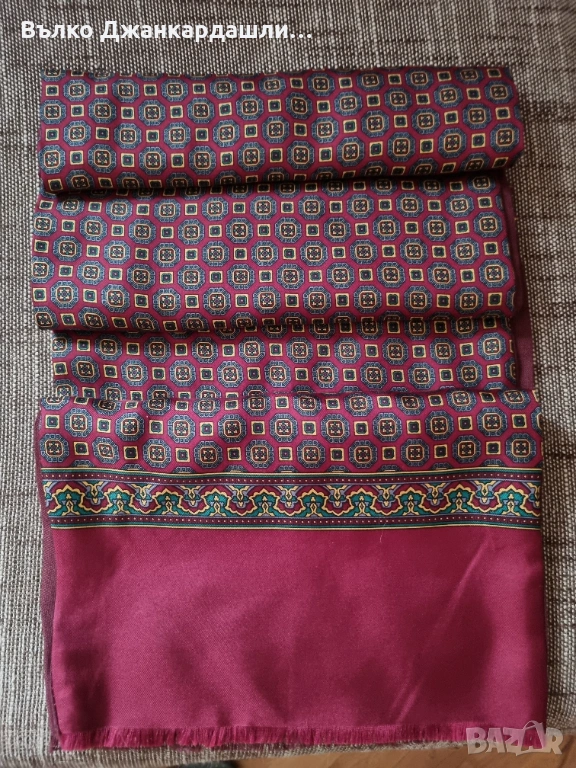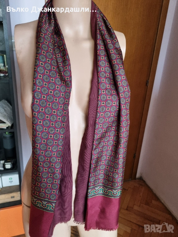 Елегантен шал за господата, които държат на изискания стил. Основният цвят е бордо- силен и затюпомнящ се. Много фина и красива материя. Вълната е много фина, а коприната лъскава и много гладка на допир.